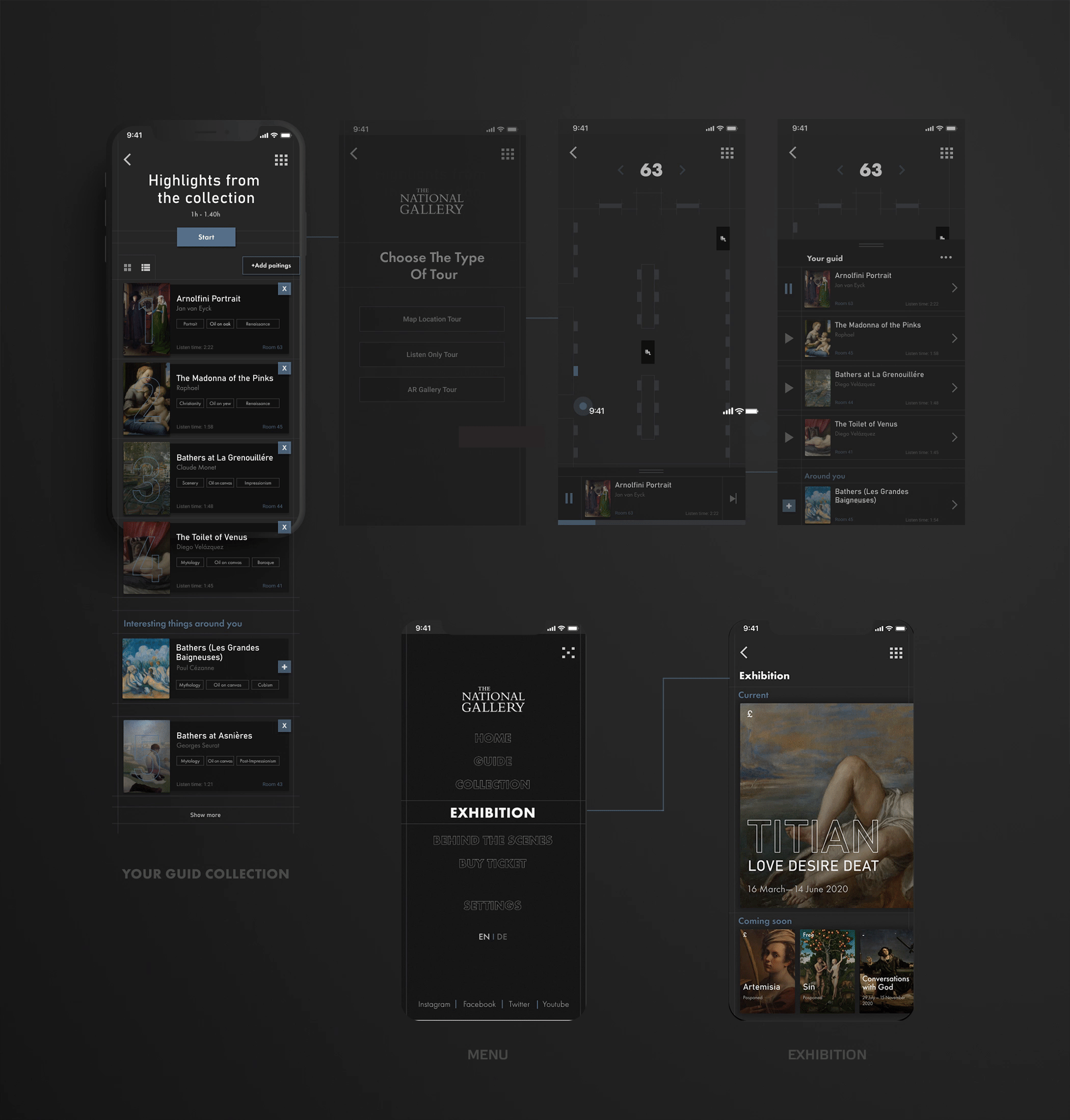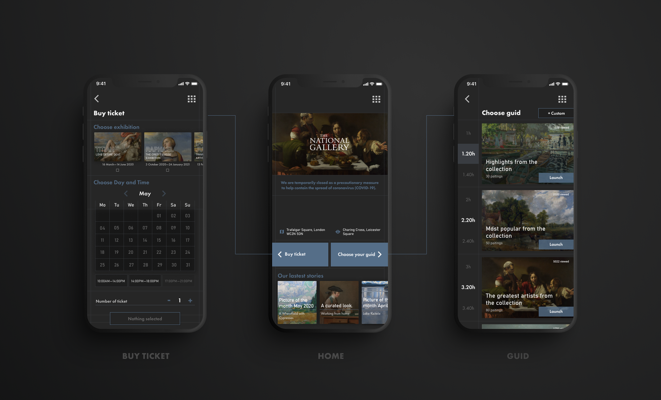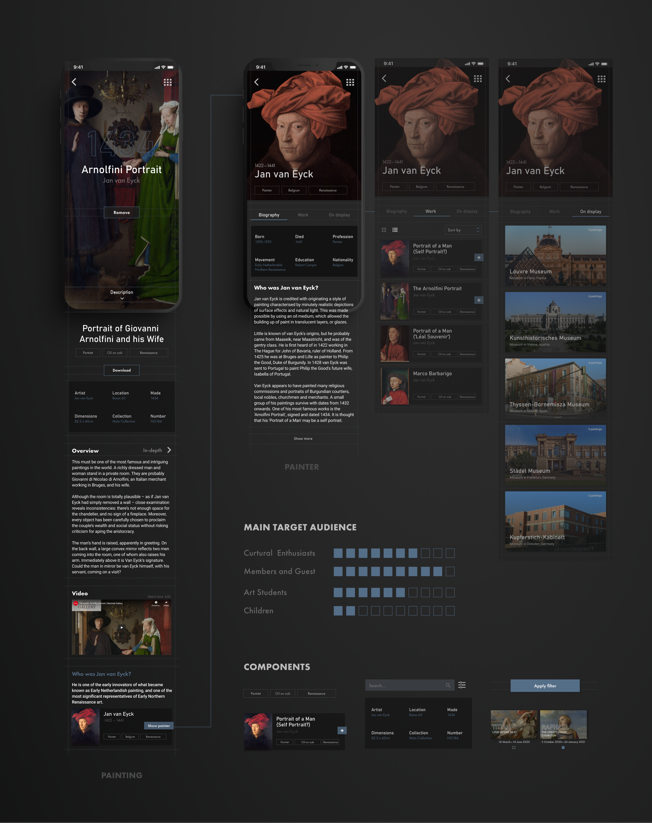 Vytvorila som aplikáciu pre National Gallery v Londýne ktorá slúži na virtuálnu prehliadku, ale aj ako médium ktoré približuje návštevníkom bližšie k umeniu. Používatelia si môžu vybrať spomedzi rôznych druhov prehliadok, podľa času ale aj podľa záujmu. Takisto majú možnosť si vytvoriť úplne custom prehliadku. Aplikáciu tiež slúži ako databáza obrazov, kde si používateľ môže jednoducho vyhľadať obrazy podla rôznych kritérií ako obdobie, štýl, zaradenie a ďalšie. Cez aplikáciu je tiež možné zakúpenie lístka na výstavy, ktoré sú vypísané a dozvedieť sa o danej výstave viac, ako napríklad kým je sponzorovaná, čo je to za umelca, a pozrieť si nejaké vybrané diela ktoré budu vystavené. Londýnska galéria je aktívna v písaní článkov a a zdieľaní procesu rekonštrukcie obrazov, preto na homepage je zmenšená verzia lastest stories pre rýchly prehlad.