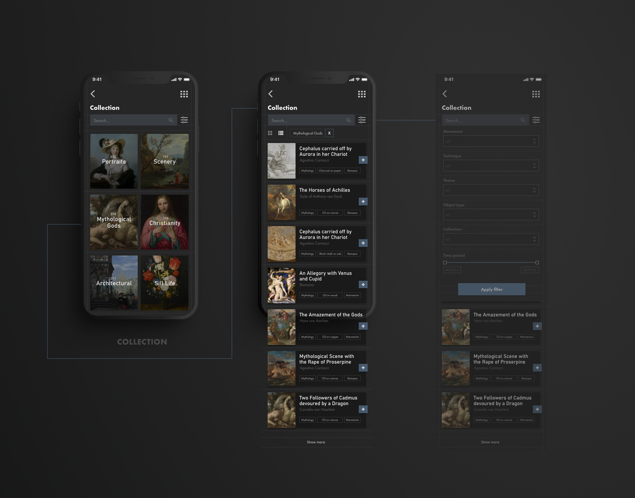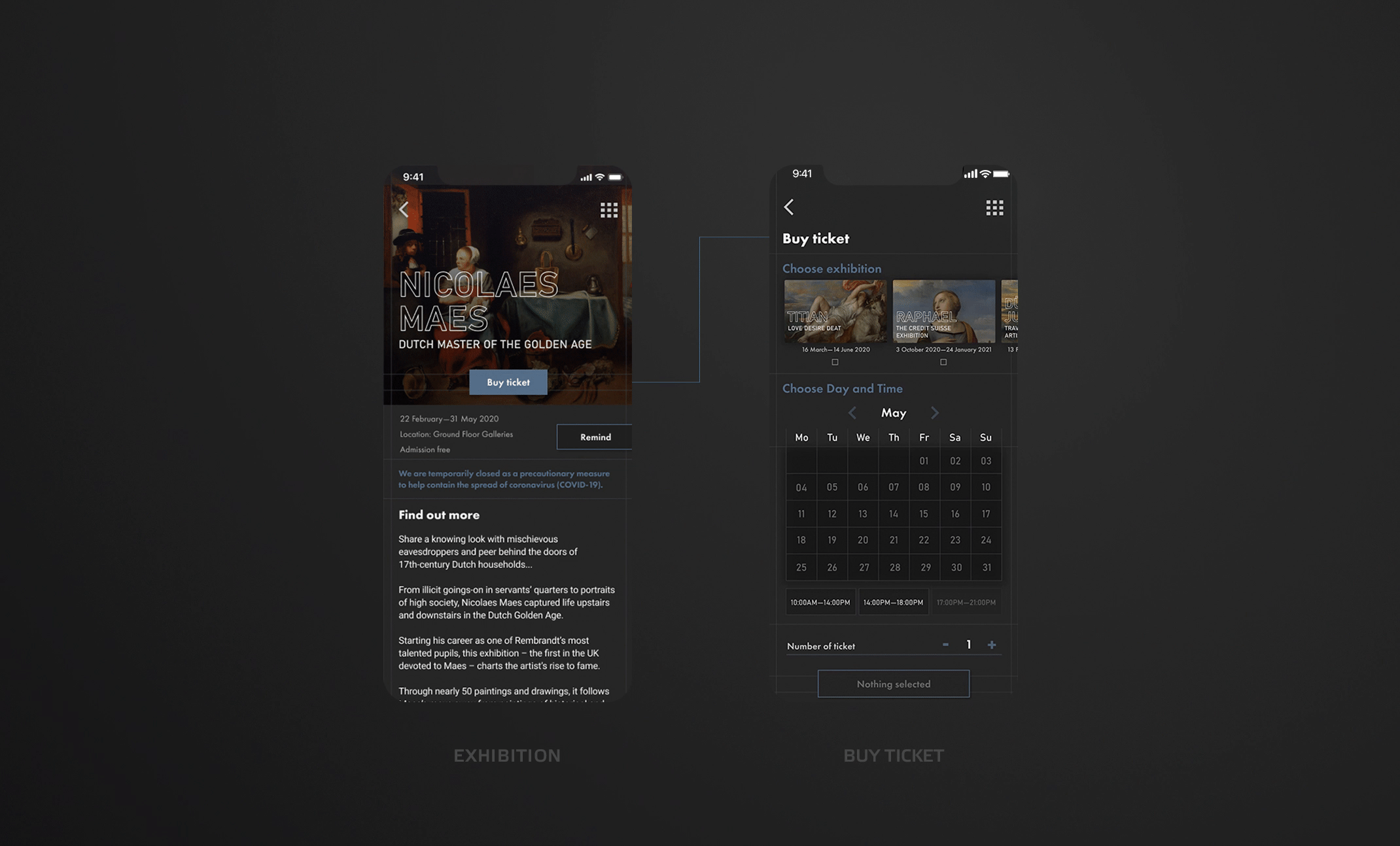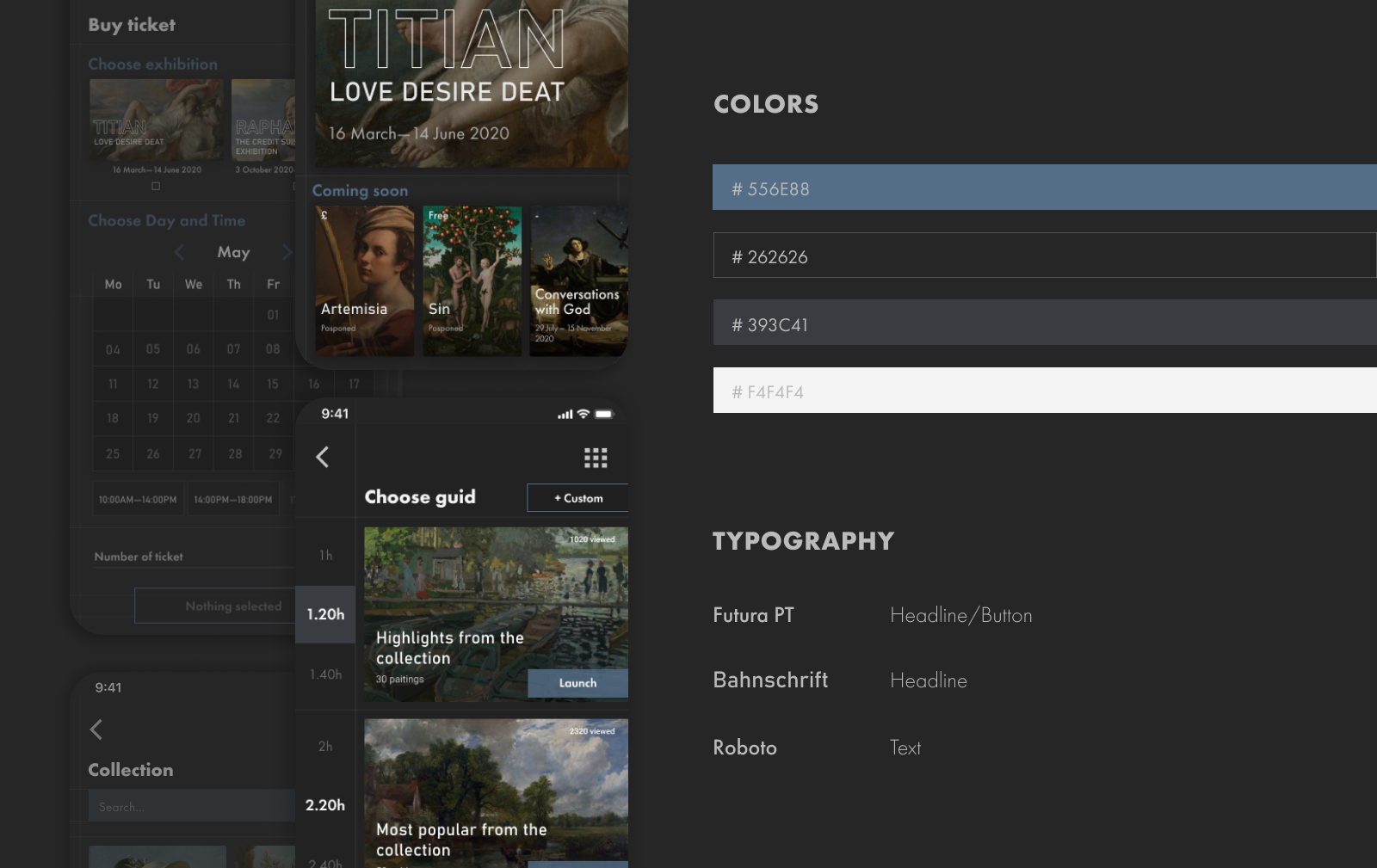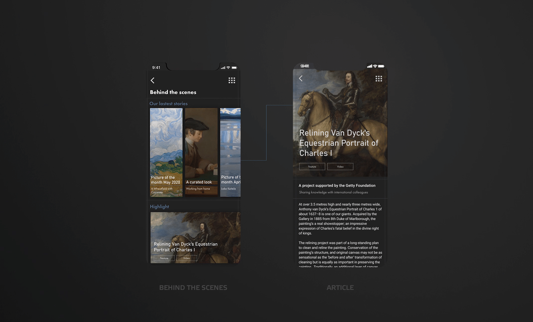 Vytvorila som aplikáciu pre National Gallery v Londýne ktorá slúži na virtuálnu prehliadku, ale aj ako médium ktoré približuje návštevníkom bližšie k umeniu. Používatelia si môžu vybrať spomedzi rôznych druhov prehliadok, podľa času ale aj podľa záujmu. Takisto majú možnosť si vytvoriť úplne custom prehliadku. Aplikáciu tiež slúži ako databáza obrazov, kde si používateľ môže jednoducho vyhľadať obrazy podla rôznych kritérií ako obdobie, štýl, zaradenie a ďalšie. Cez aplikáciu je tiež možné zakúpenie lístka na výstavy, ktoré sú vypísané a dozvedieť sa o danej výstave viac, ako napríklad kým je sponzorovaná, čo je to za umelca, a pozrieť si nejaké vybrané diela ktoré budu vystavené. Londýnska galéria je aktívna v písaní článkov a a zdieľaní procesu rekonštrukcie obrazov, preto na homepage je zmenšená verzia lastest stories pre rýchly prehlad.