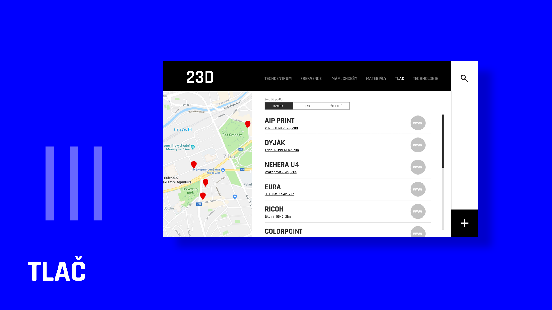 Webová aplikace 23D vytvorená ako „skratka“ 23Designu. Zber dát a prehľad informácii nápomocných k štúdiu študentov ateliérov ADD a ADE pre uľahčenie získania už nadobudnutých informácii. Stránka obsahuje prehľad o tom, čo je možné na u16 a mimo nej. Prehľad tlačových centier, materiálov a technologii na základe odporúčaní študentov. Súčaťou sú tiež podklady pre prípravu materiálov spracovávaných v našom technickom zázemí a ponuka zvyškových materiálov.
