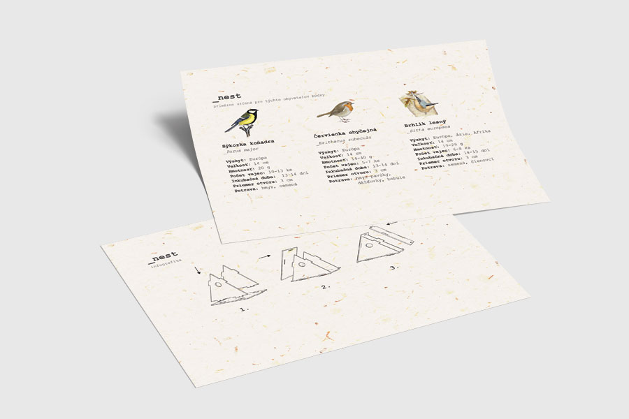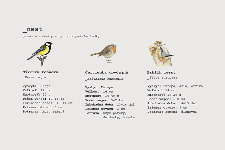 Koncept vtáčej búdky predstavuje jednoduché flatpack riešenie na zostavenie, slúžiace len dočasne (max. 1-2 sezóny), určené primárne pre dutinových hniezdičov - Sýkorku koňadru, Červienku obyčajnú, Brhlíka lesného...
