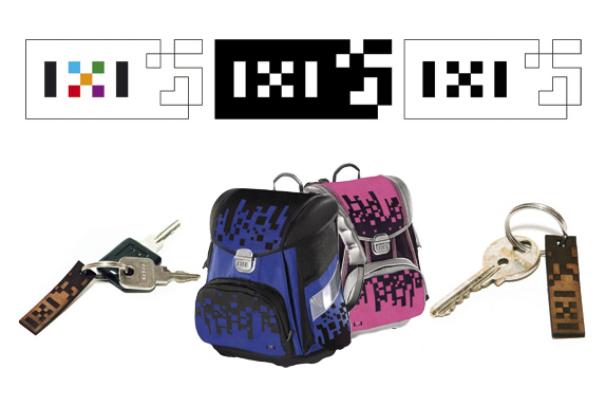 Logo IXI aplikováno na školních taškách a klíčenkách.