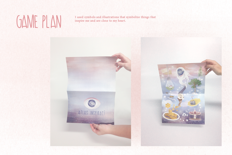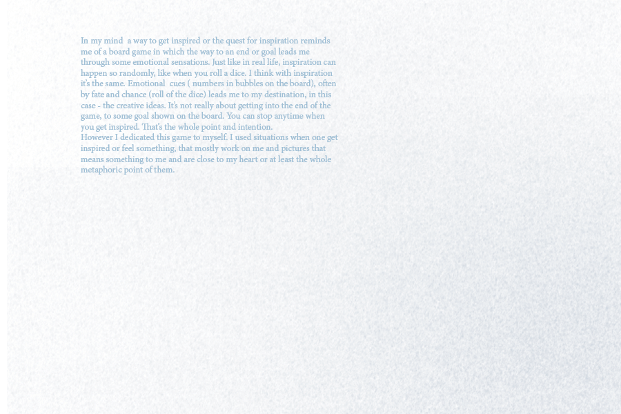 Svoj „atlas inspirácie“ som poňala ako spoločenskú hru pre jedného, kde „sled emocionálne pôsobiacich udalostí“ predstavuje cestu (políčka), po ktorej sa človek – panáčik pohybuje na základe čísla, ktoré hodí kockou.