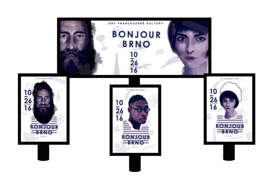 Tvorba jednotného vizuálneho štýlu festivalu Bonjour Brno na tému frankofonních zemii: (Quebec, Belgie, švycarska, Afrika) Návrh vizuálneho štýlu bol následne vybraný a realizovaný v roku 2016.