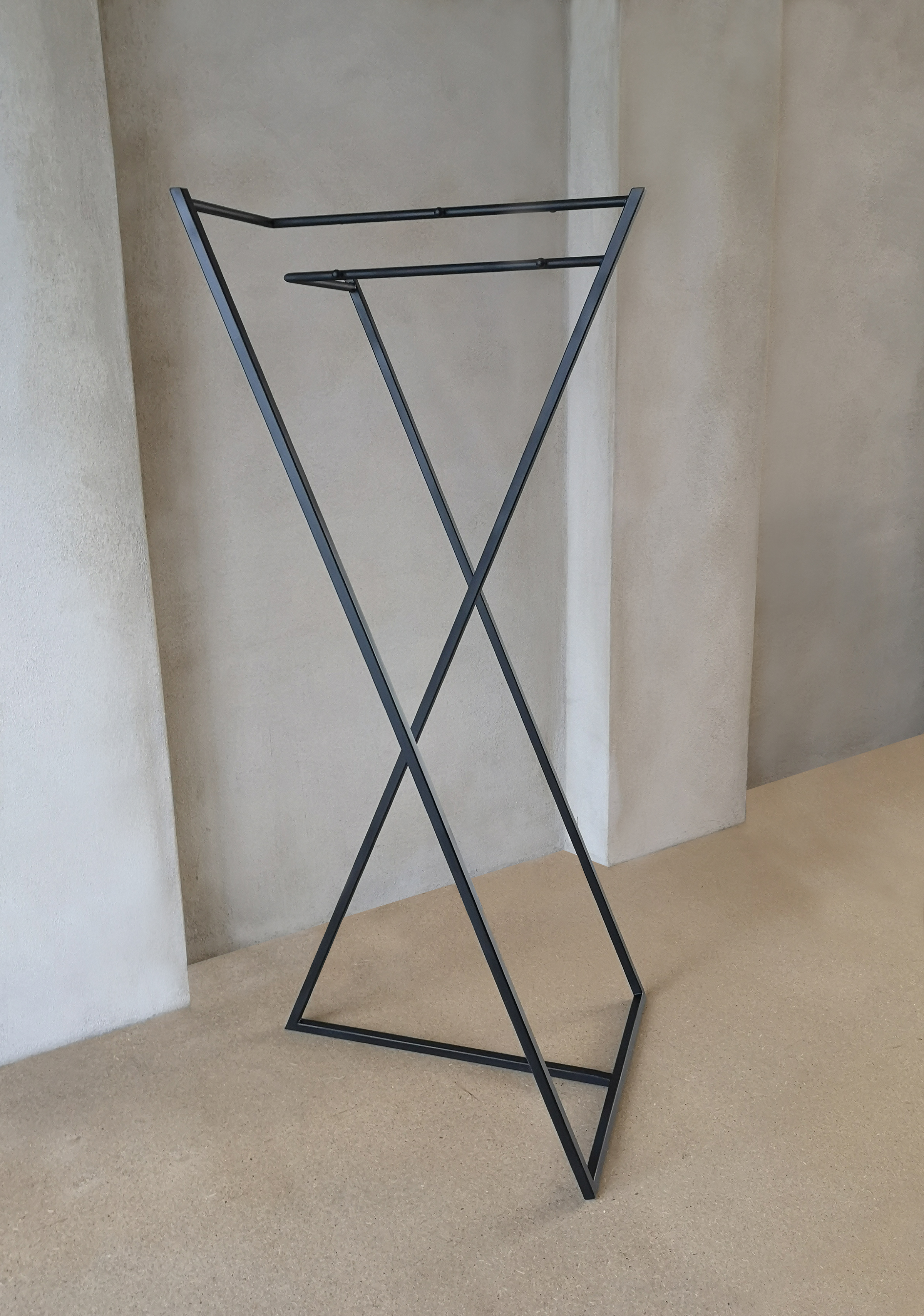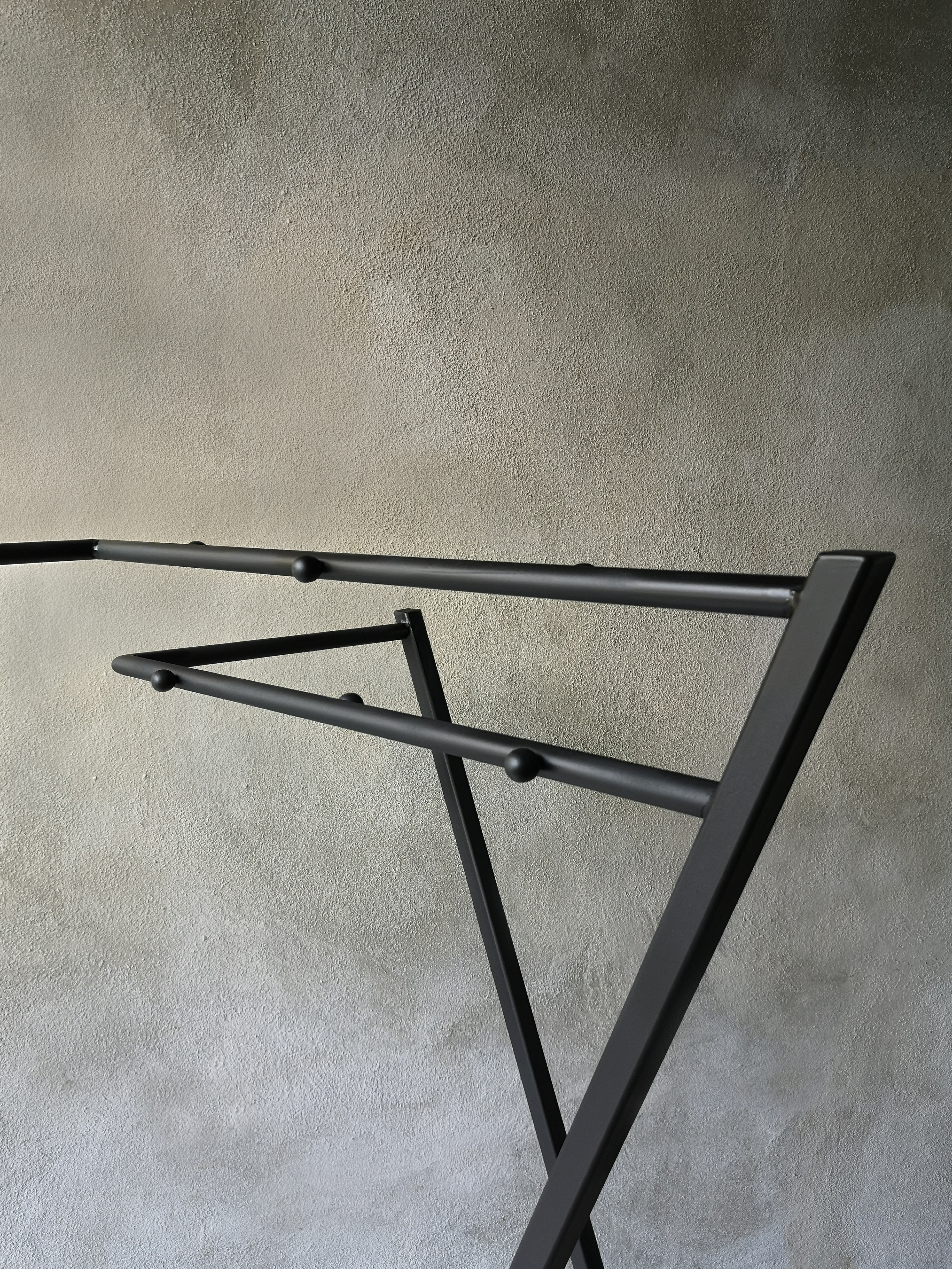 Věšák je navrhnut tak, aby působil jednoduše a čistě a nerušil, když se na něj pověsí různobarevné oblečení. Lze jej umístit ke zdi i do prostoru. Pohled z boku nám připomíná přesýpací hodiny, z přední strany uvidíme dva pomyslné obdélníky, kdy je jeden nižší. V horní části je šest háčků ve tvaru koulí. Umístěny jsou po obou stranách kulatin po třech pro lepší věšení. Boční části kulatin jsou určeny na zavěšení oblečení na ramínkách, případně na zavěšení deštníků či šál. Lze zavěsit 4–8 ramínek dle rozměrů věšeného oblečení.