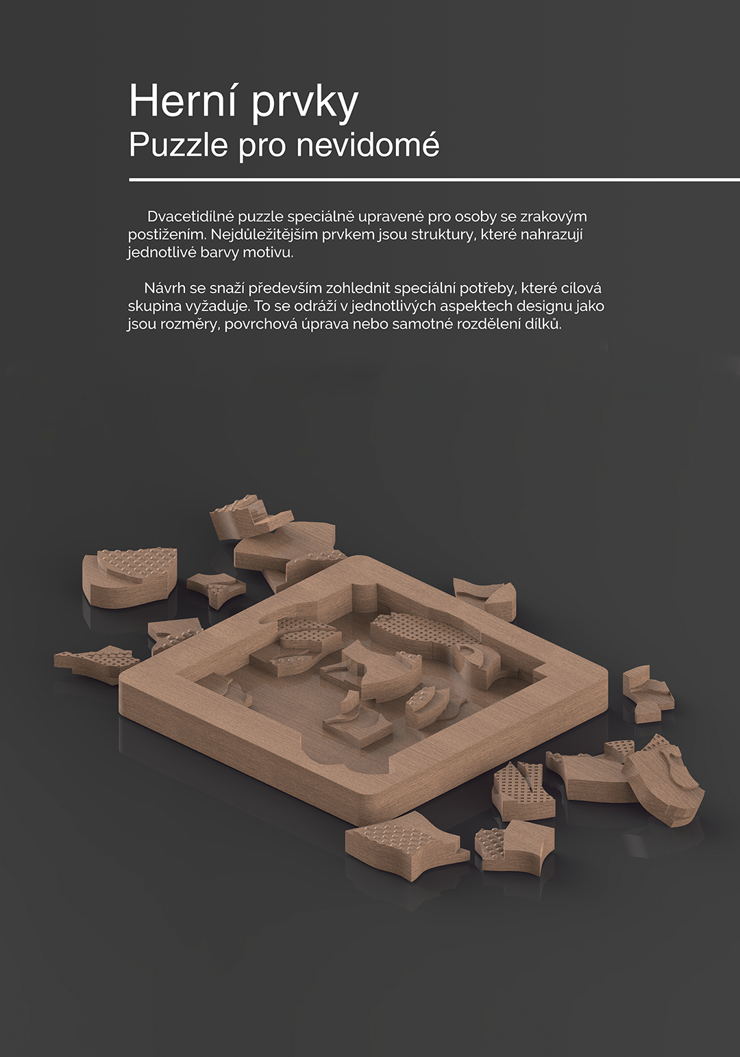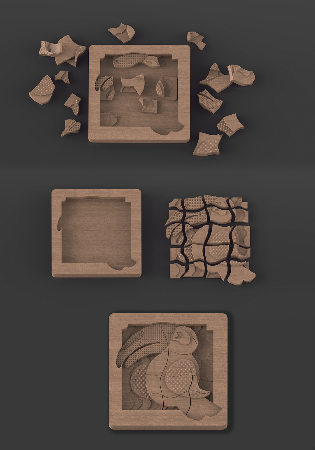 Dvacetidílné puzzle speciálně upravené pro osoby se zrakovým postižením s motivem tukana. Nejdůležitějším prvkem jsou struktury, které nahrazují jednotlivé barvy motivu. Návrh se snaží především zohlednit speciální potřeby, které cílová skupina vyžaduje. To se odráží v jednotlivých aspektech designu, jako jsou rozměry, povrchová úprava nebo samotné rozdělení dílků. Finální výrobek je tištěn na 3D tiskárně.