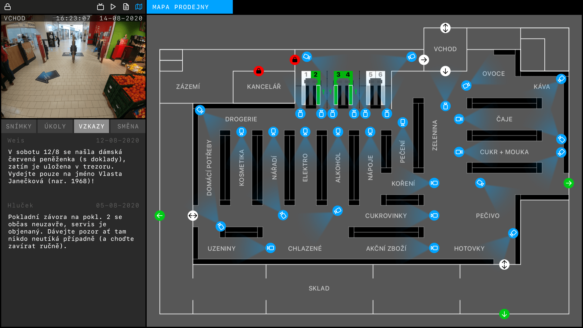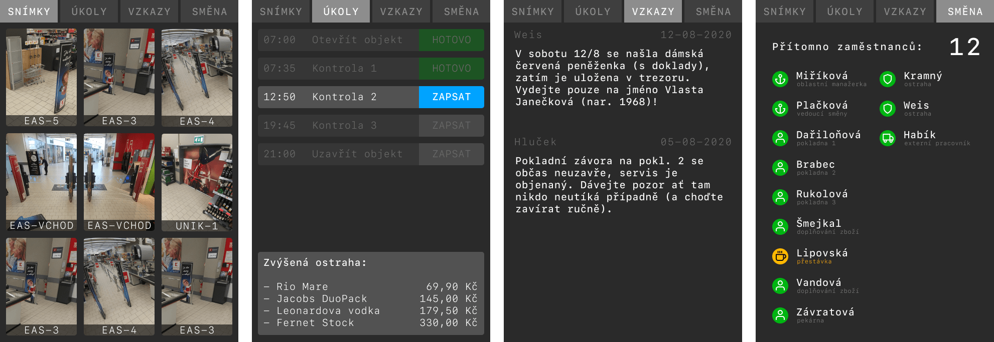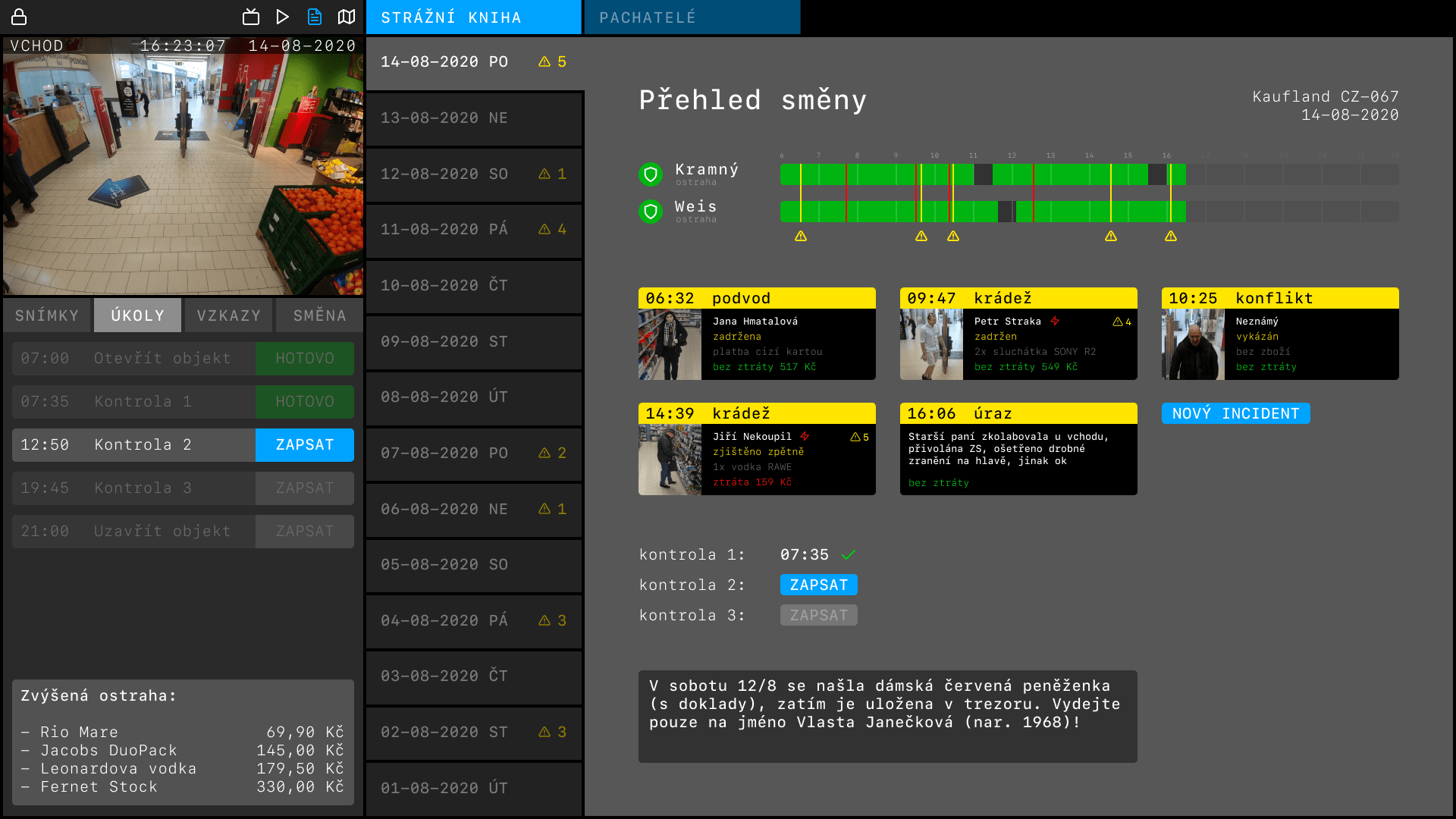 Bezpečnostní systém, který je určen pro nasazení v obchodních řetězcích. Je rozdělen do čtyř pracovních režimů, zahrnuje elektronickou strážní knihu, databázi pachatelů, a další užitečné funkce, které mají usnadnit a urychlit práci strážného. Při tvorbě jsem vycházel z vlastních poznatků a zkušeností, protože jsem jako strážný pracoval ve třech různých prodejnách a s mnoha technickými systémy.