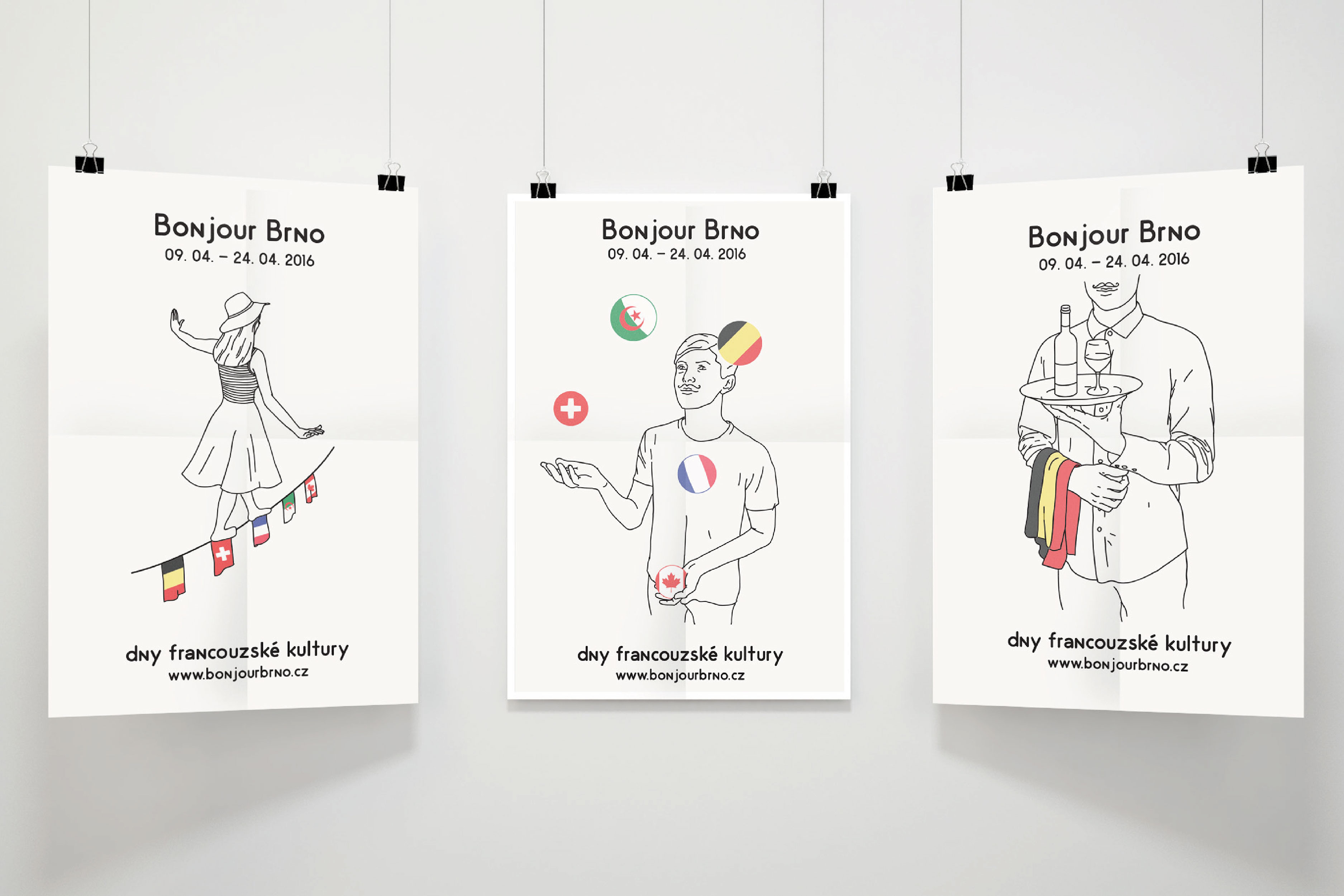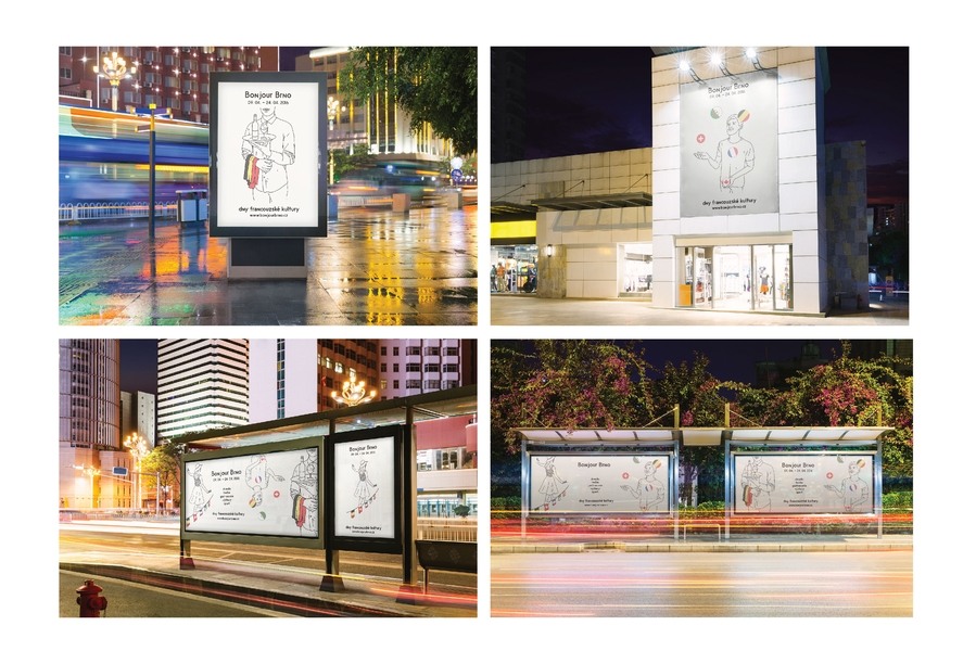 Visual style for french festival in Brno. The main theme of festival is french speaking countries, so I've created french themated illustrations with flags of these countries placed into the objects of illustrations.