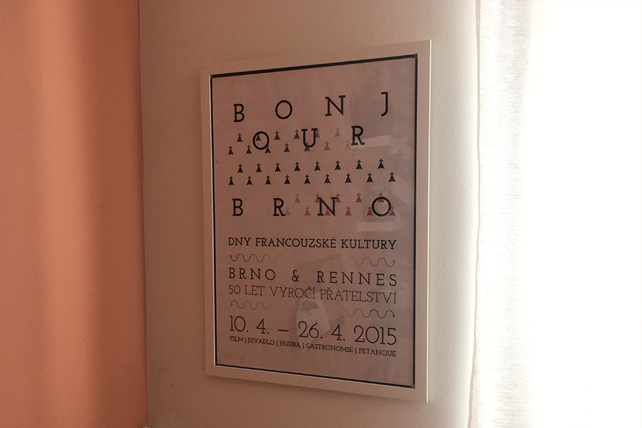 Plakát pro kulturní festival s názvem Bonjour Brno, který se zaměřuje na propagaci francouzské kultury v Brně.