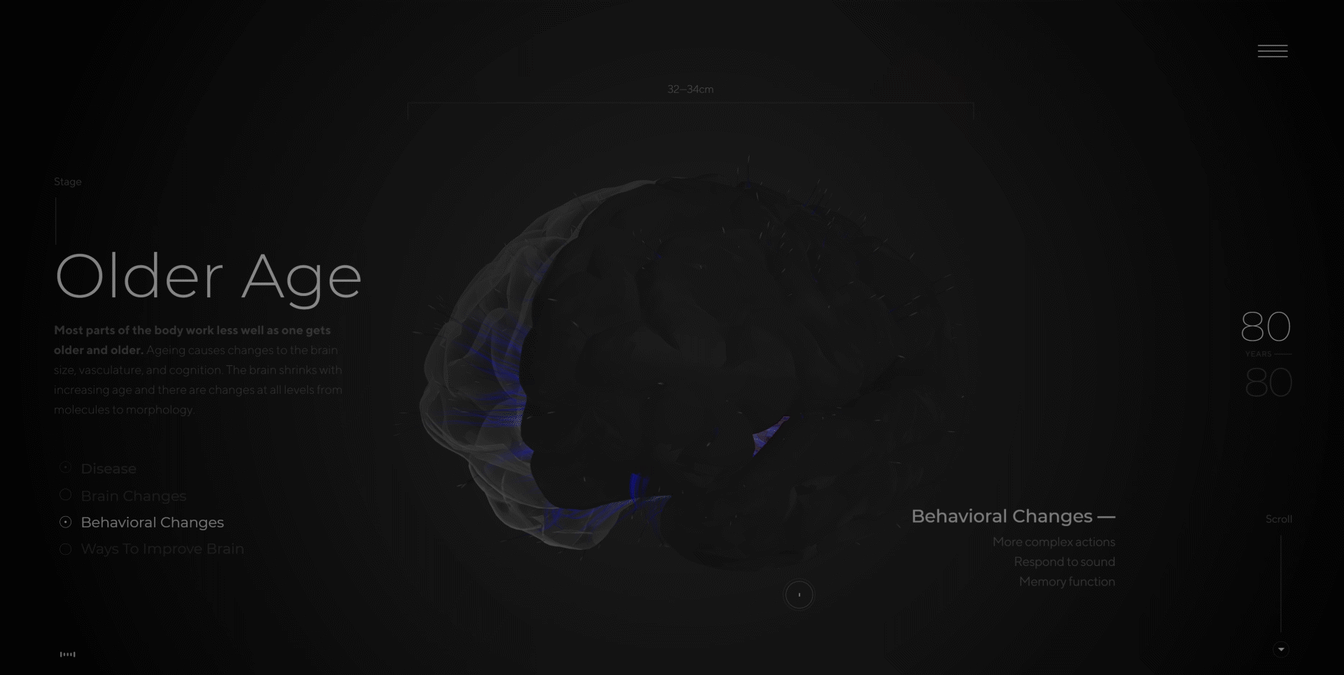 Na zadanie čas som sa rozhodla spracovať webovú stránku vývojových fázach mozgu. Od narodenia cez pubertu až do pokročilejšieho veku. Mozog sa mení vo veľkosti, farbách a množstva neurónov. Web obsahuje informácie ako percentuálna šanca choroby, zmeny správania a zmeny samotného mozgu. Popri tom sa používateľ dozvie ako zvýšiť mozgovú aktivitu.