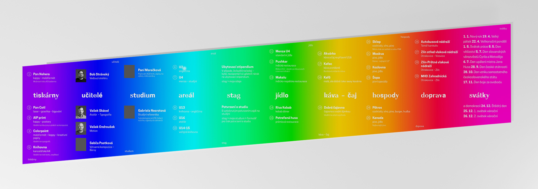 Obsah pro kohokoliv, každý si vybere své! Od pomoci s tiskárnami přes plejádu skvělých učitelů, takže už si je nebudete plést s magistry a doktorandy, přes průvodce studiem a areálem, stagem, jídlem, pro fajnšmekry i kavárny s čajovnami, pro labužníky seznam hospod, dopravní spojení a i to nejdůležitější, a to dny, kdy nebudete muset do Zlína jet! Svátky!