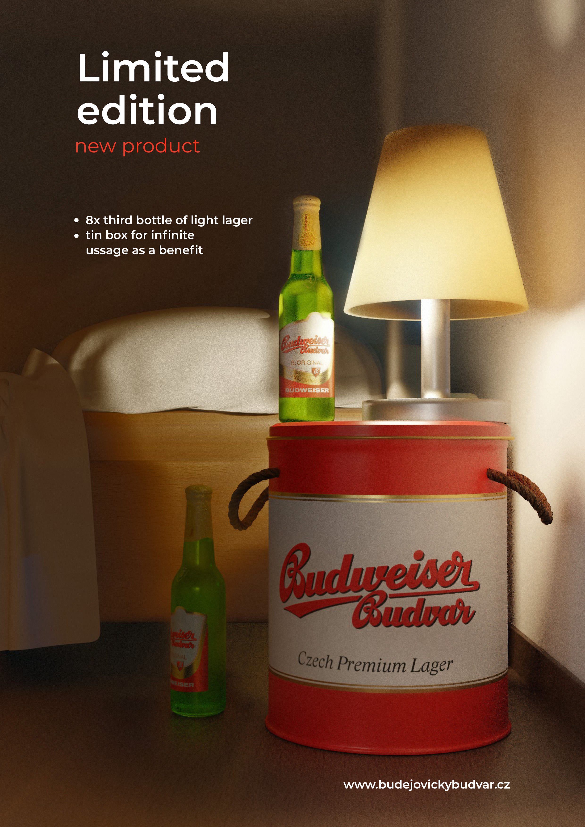 Inzerát na limitovanou edici balení piv Budweiser propaguje multifunkčnost balení. Cílem bylo zaujmout divákovu pozornost neobvyklým umístěním plechové dózy do interiéru, jako alternativu nábytku. Svícení je zvolené tak, aby produkty byly zřetelné, ale zároveň aby z obrazu vycházela intimní atmosféra domácího prostředí. Text je na inzerátu spíše sekundární element. Bylo potřeba aby písmo nekolidovalo s estetikou etikety na barelu ani na lahvi, ale zároveň aby bylo na formátu A4 dostatečně zřetelné.