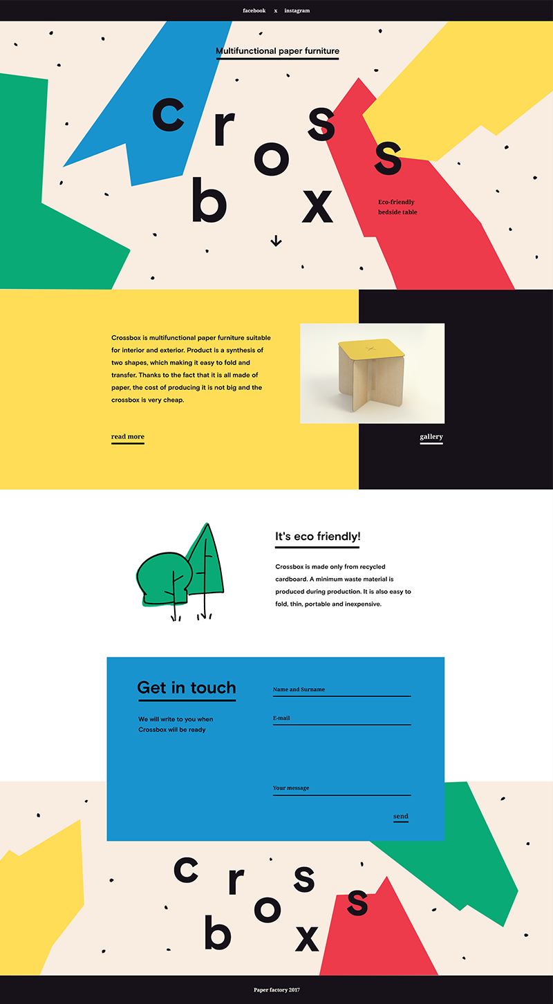 Crossbox je papierový nábytok ktorý si zakladá na ľahkej manipulácií, skladnosti a finančnej nenáročnosti. Jeho rozmery vychádzajú z klasického nočného stolíka. Konštrukcia je navrhnutá tak, aby pri výrobe vznikal čo najmenší odpad.