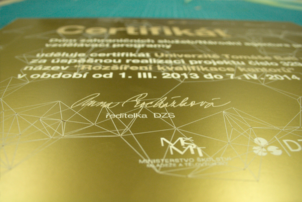 Certifikát určený pro Ministerstvo školství, mládeže a tělovýchovy. Návrh je realizován technikou laserování do zlatého papíru. Podkladové obrazce jsou generované skriptem a slouží jako unikátní pseudo–vodoznak a ochranný prvek pravosti. Certifikát je jedinečný z každého úhlu díky lomu a odrazu světla, taktéž vytváří kvazi 3D mapu podkladových obrazců při průhledu proti světlu.