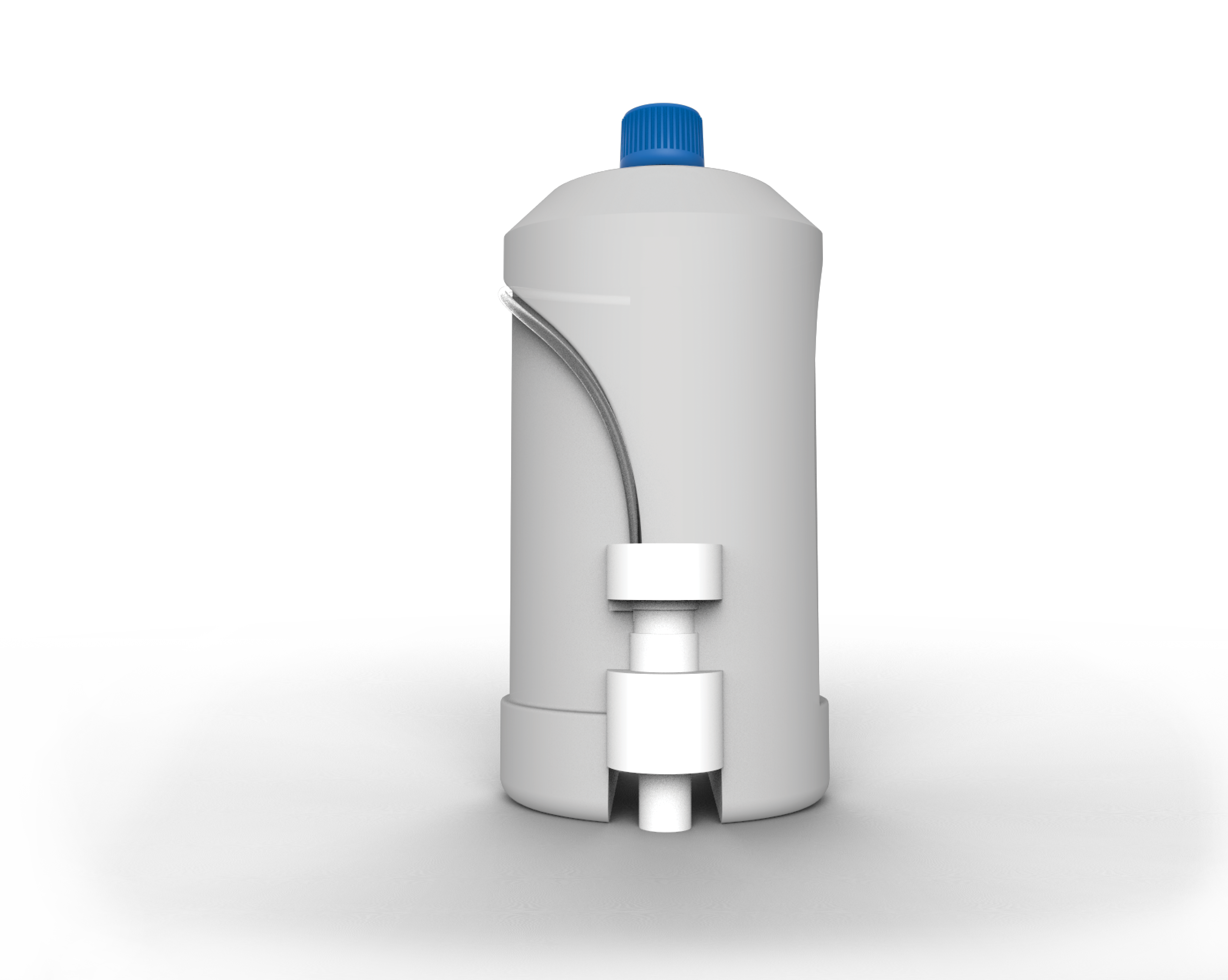 Design kanystru na aditivum AdBlue, bez nutnosti distribuce v krabici, s nálevkou na kapalinu integrovanou přímo do kanystru. Ekonomické i ekologické řešení problému.