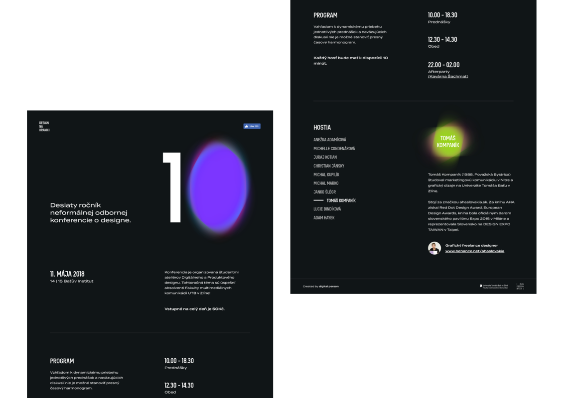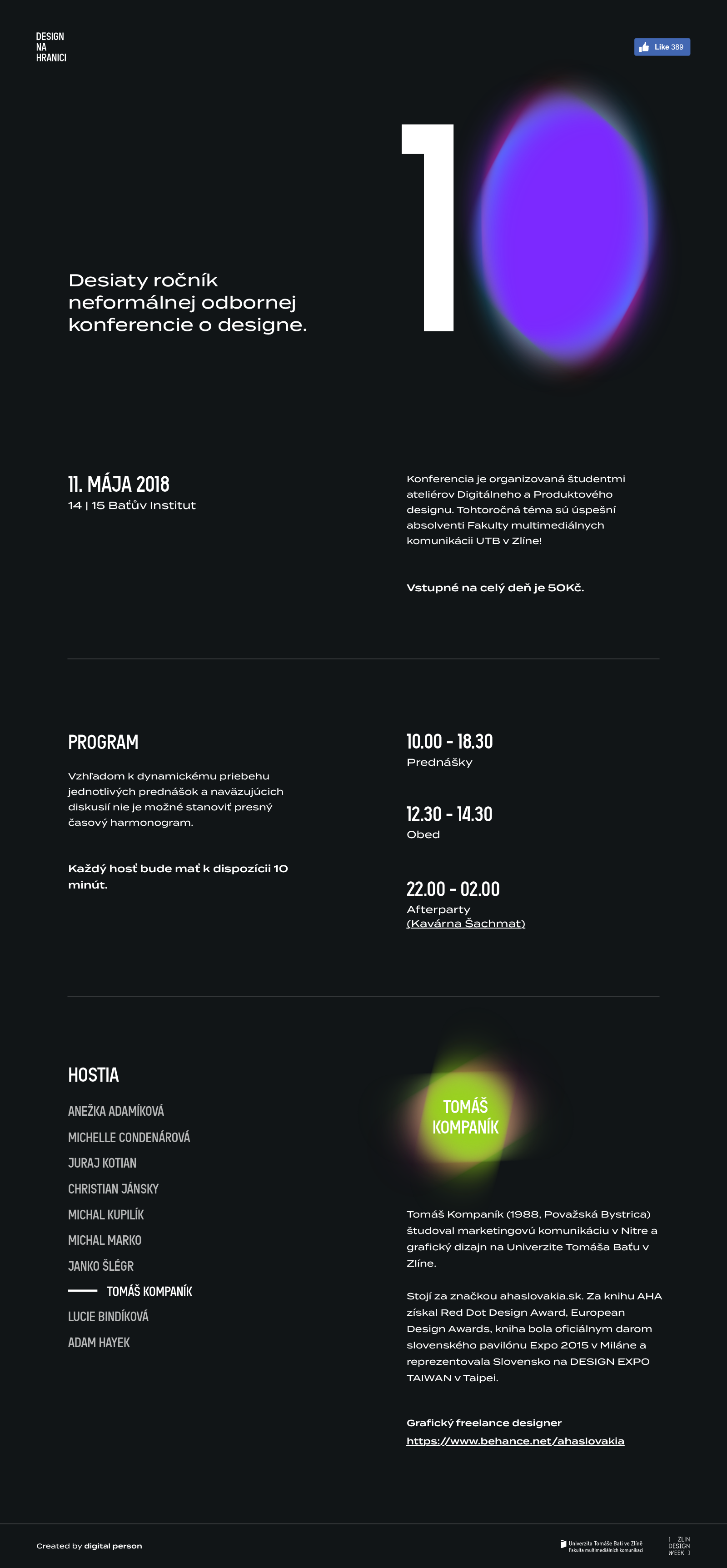 Design na hranici je neformálna odborná konferencia o designe, ktorú organizujú študenti ADD a ADE. Týmto rokom je výnimočná a to hneď z dvoch hľadísk. Prídu úspešní absolventi našej fakulty a je to navyše jubilejný desiaty ročník tak prečo to nespojiť? Vizuál sa odvíja od úspechu absolventov, ktorý je znázornený "žiarou úspechu", elementom ktorý sa po opustení školy zmenil zo všedného - obyčajného na tak žiarivý ako len môže byť! Prejsť cez bránu úspechu a zažiariť je pre absolventa mimoriadne dôležité.