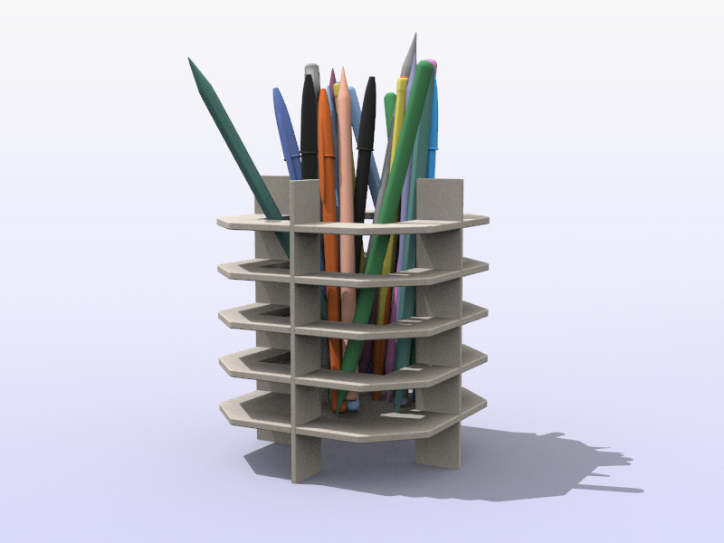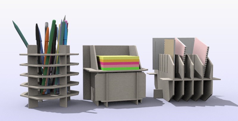 Sada troch doplnkov na pracovný stôl je vyhotovená z knižnej lepenky (recyklovaný materiál) o hrúbke 2 a 3 mm. Doplnky sú poskladané z plošných dielov, ktoré do seba zapadajú pomocou zárezov v dieloch. Všetko drží bez použitia lepidla a dá sa jednoducho rozložiť a opätovne zložiť.