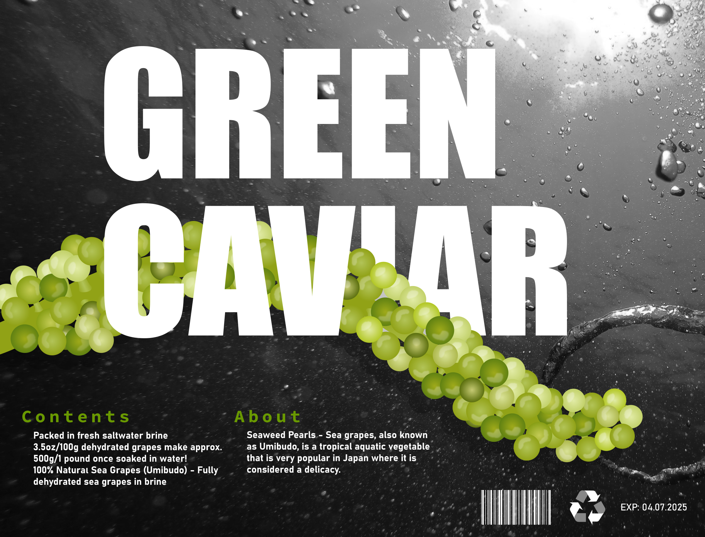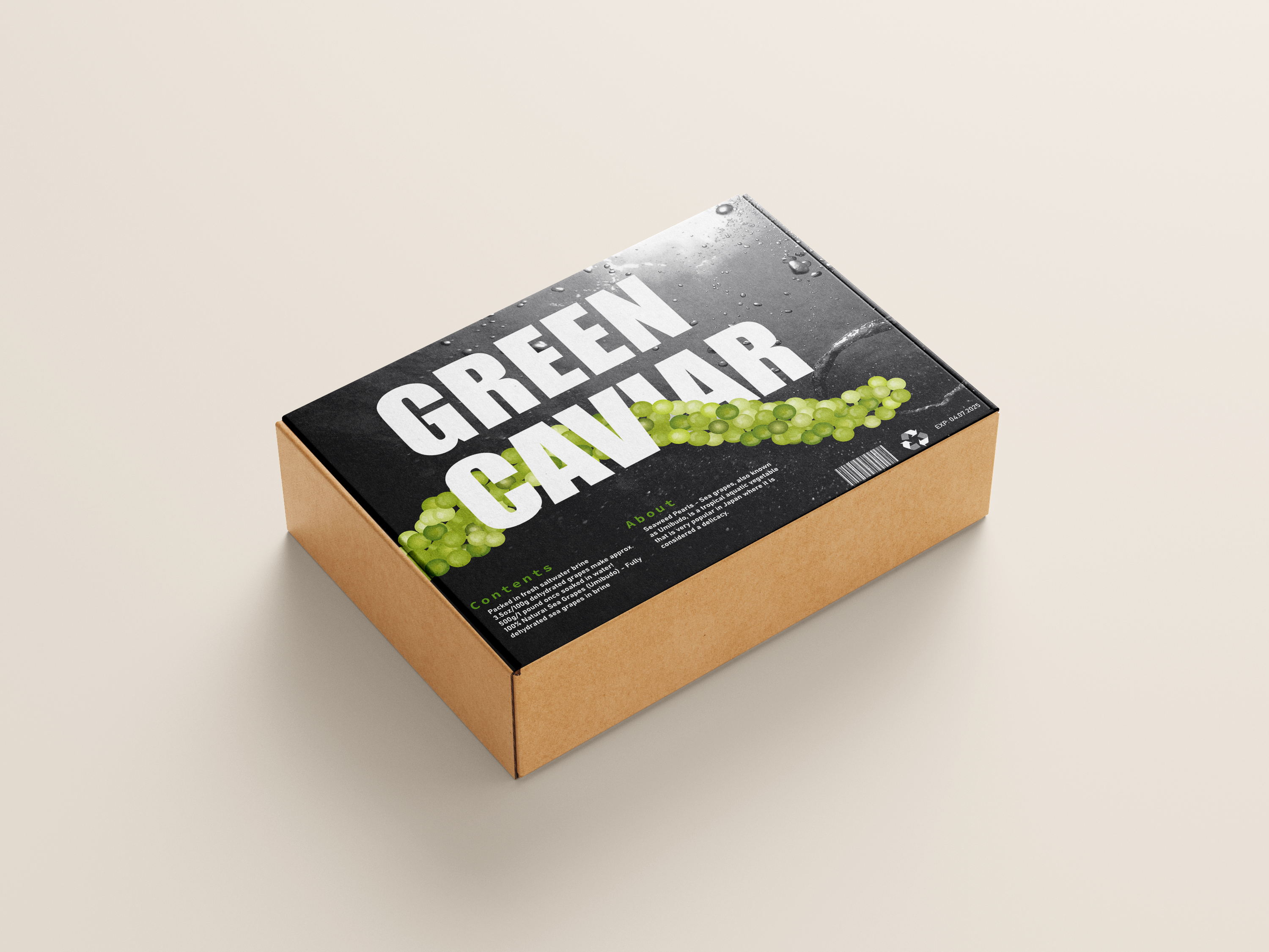 Design obalu konzumného oleja z hroznových semiačok a zeleného kaviáru.