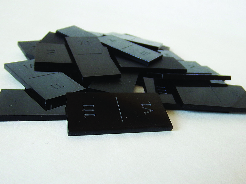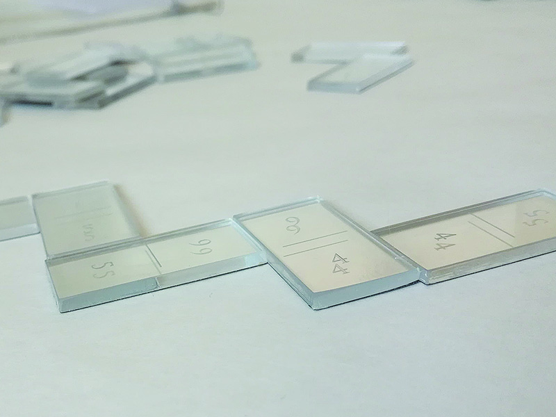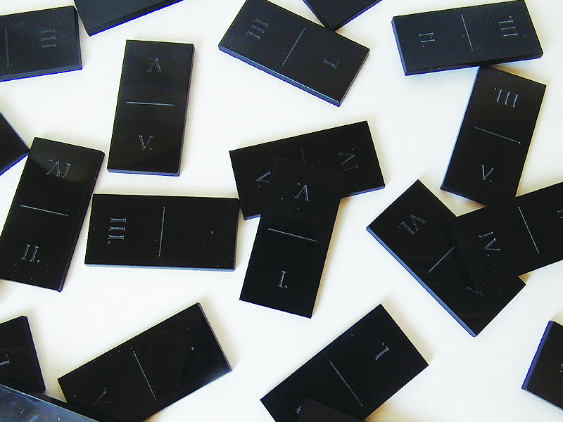 Rozhodla som sa vytvoriť domino, kde som použila rímske číslice a klasické čísla namiesto klasických bodiek. Domino je vylaserované do plexiskla. Vyrobila som dva druhy, prvé je čierne domino s rímskymi číslicami a druhé je ,, zrkadlové,, domino s klasickými číslami. Dominá sú malej veľkosti takže sú ľahko prenosné a nezaberajú veľa miesta a v kombinácií s použitým materiálom pôsobia mierne luxusne a hráča zaujmú na pohľad.