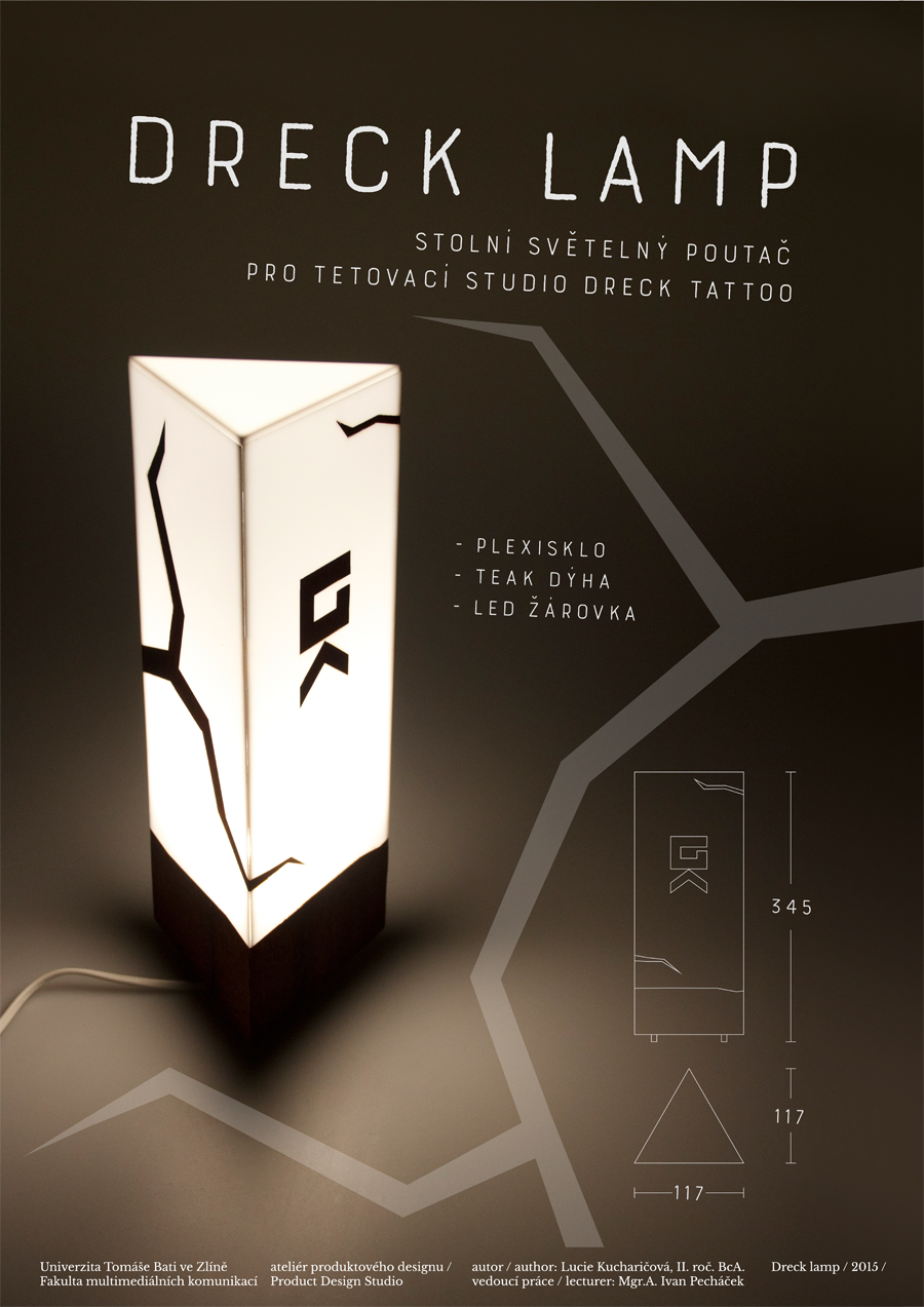 Stolní světelný poutač pro tetovací studio Dreck Tattoo vyrobený z mléčného akrylového skla a teak dýhy. Tvar dýhy znázorňuje cestu vpíjení inkoustu do kůže, nebo také růst - konstrast dvou materiálů jako u tetování - kůže a jehla.