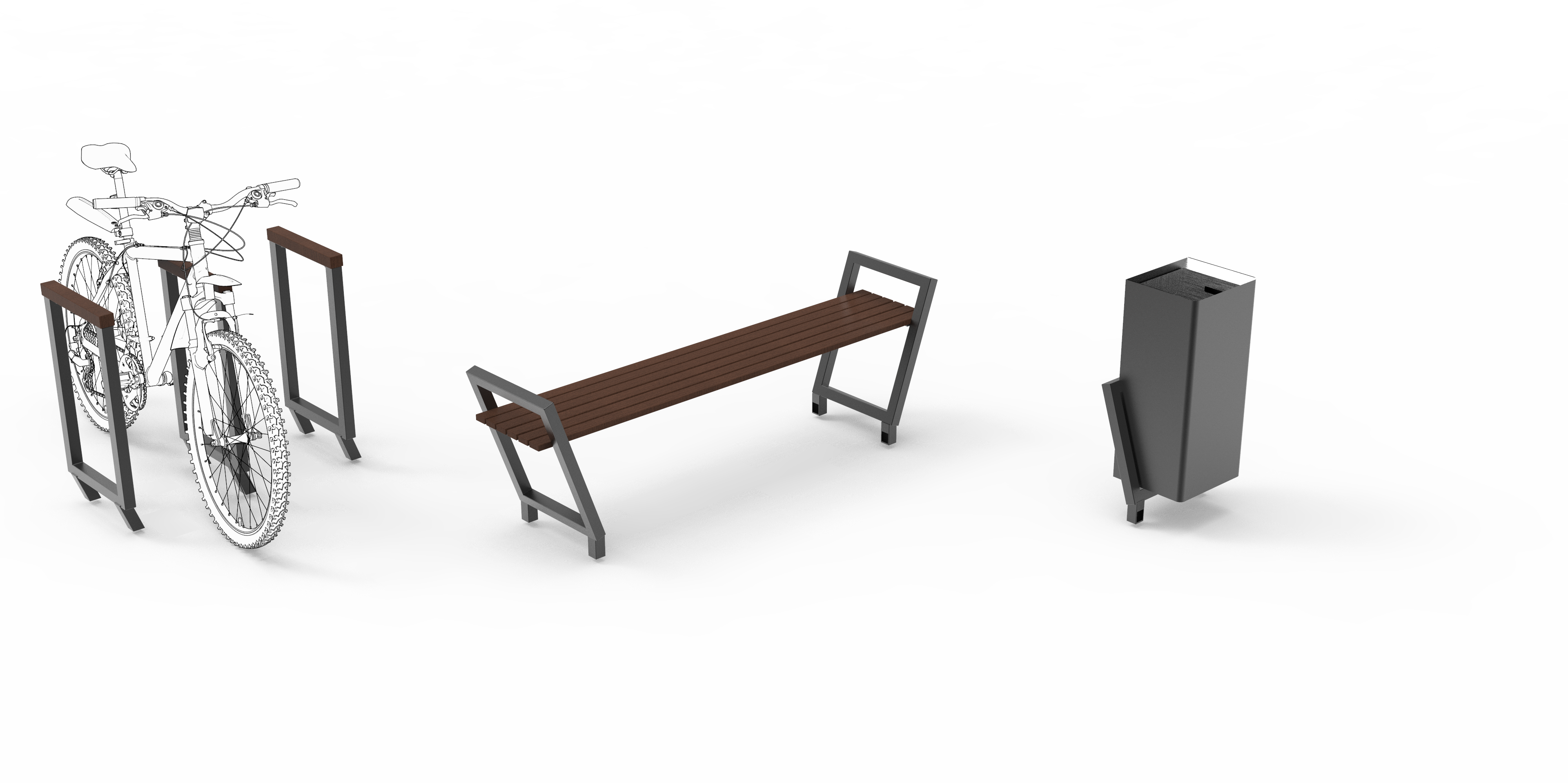 Mobiliář před prodejny COOP. Návrh zahrnuje lavičku, koš a stojan na kolo