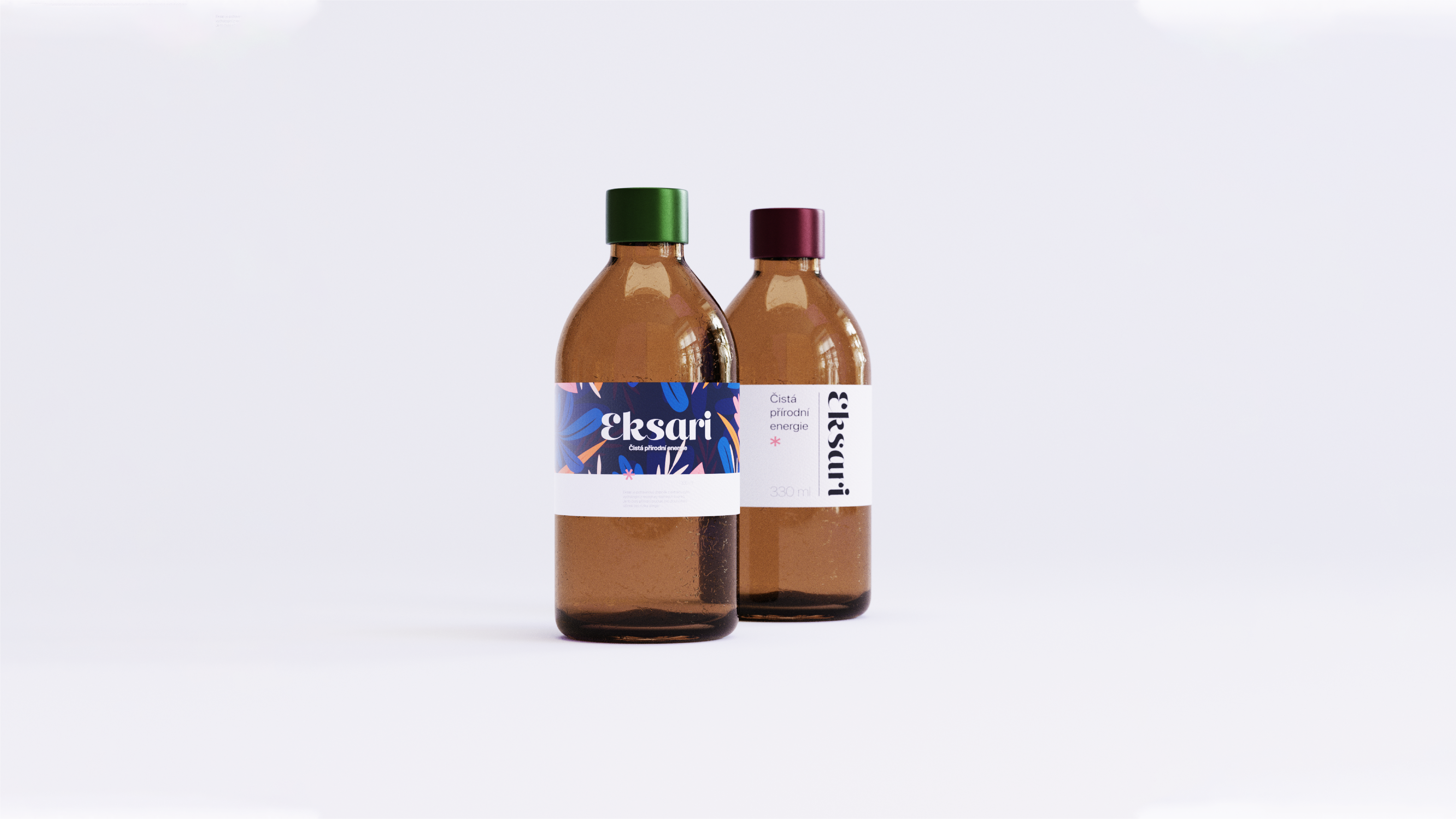 Eksari je potravinový doplněk z extraktu bylin, vycházející z receptury sibiřských Evenků. Já jsem tento projekt pojal spíše více stylizovaně, grafika je vytvořená z jednoduchých tvarů listů a bylin. Barevnost je spíše z chladnějších barev a semtam se někde objevuje teplejší barva. Logo je velice jednoduché, složené jen z nápisu, podnadpisu a typografické hvězdičky (ta je jen ozdobný prvek).
