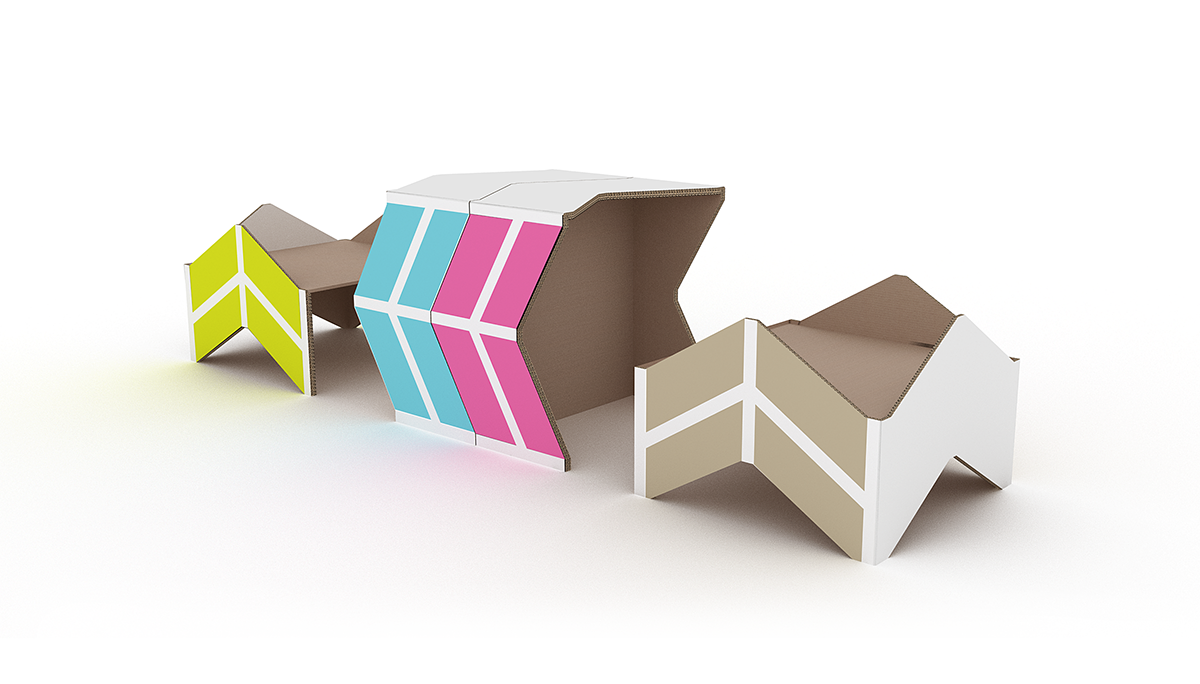 Nábytek pro děti složený ze čtyř stejných prvků, které do sebe zapadají. Otáčením a skládáním vznikají různé kombinace - lavice, úložný regál nebo stůl se stoličkou.