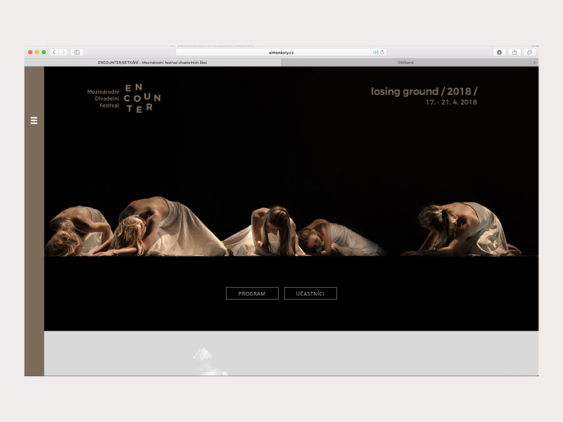 Vizuální styl pro mezinárodní festival divadelních škol ENCOUNTER/SETKÁNÍ. Téma festivalu: Losing ground. SETKÁNÍ/ENCOUNTER je mezinárodní festival divadelních škol s více než pětadvacetiletou tradicí. Jedinečnost festivalu spočívá v tom, že hlavní organizátory tvoří studenti Divadelní fakulty Janáčkovy akademie múzických umění v Brně.