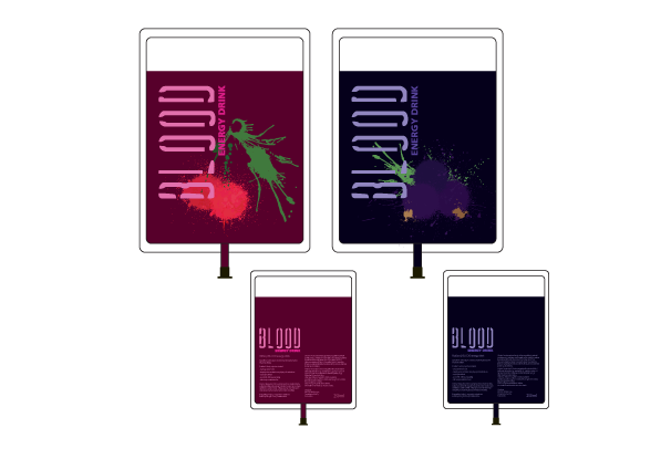 Obal energy drinku Blood znázorňuje krevní transfuzi. Nápoj je uzavřen v průhledné plastové folii a měl by být zavěšen svisle v chladícím boxu.