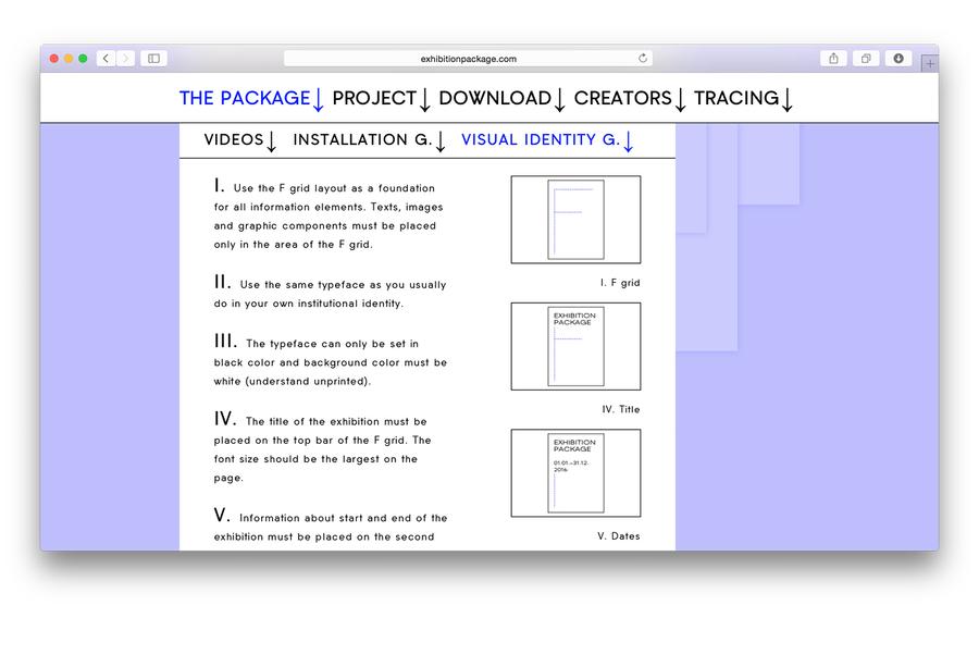 An exhibition is prepared and all its components can be found in a virtual package. The content of the package are creative outputs, all curatorial texts, instructions for installation and guidelines for applying visual identity. The package can be found and downloaded only from exhibitionpackage.com website.