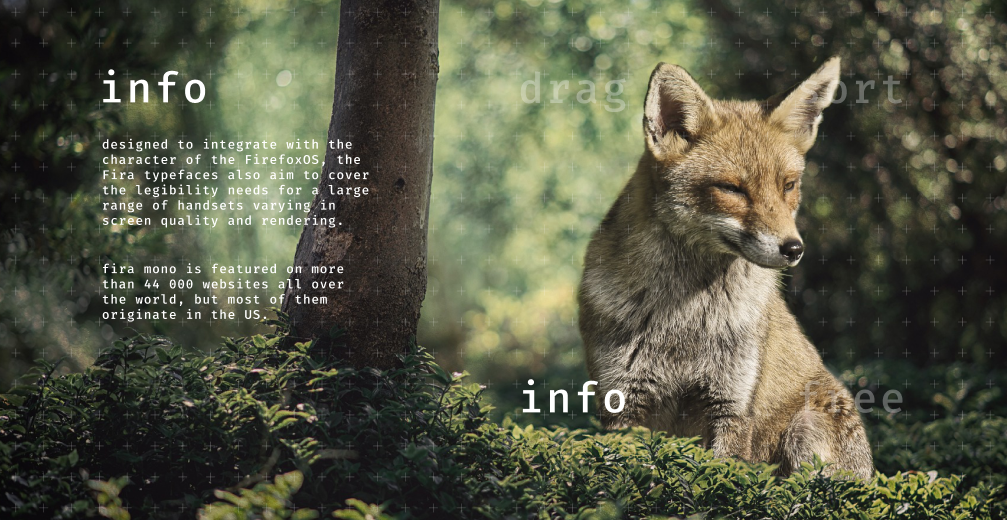 Tato jednoduchá microsite zobrazuje font "Fira Mono", který je volně dostupný z Google Fonts. Jeho hlavní vlastností je stejná šířka všech znaků. Toho využívám při práci v mřížce, která je svazující, ale zároveň vybízí ke zkoumání nových možností prezentace. Celá microsite je koncipována tak, aby nebylo potřeba klikat. Aktivní prvky reagují na hover, jediná akce navíc je vyžadována pouze před stažením fontu (stisknutí klávesy ENTER pro potvrzení). Fonty z rodiny Fira byly původně navrženy pro prohlížeč Mozilla Firefox, proto na pozadí stránky pracuji s obrázkem lišky. S liškou si také spojuji řešení posuvného hlavolamu na úvodní stránce.