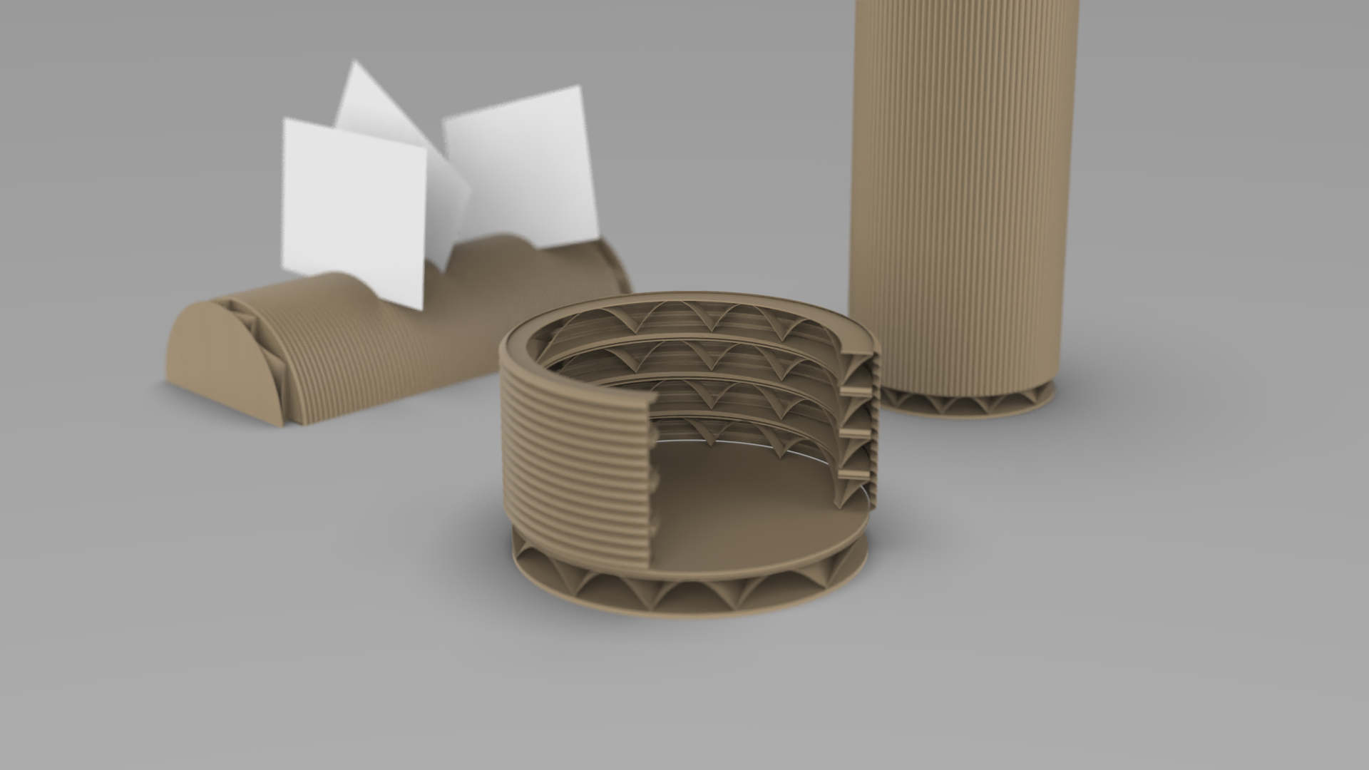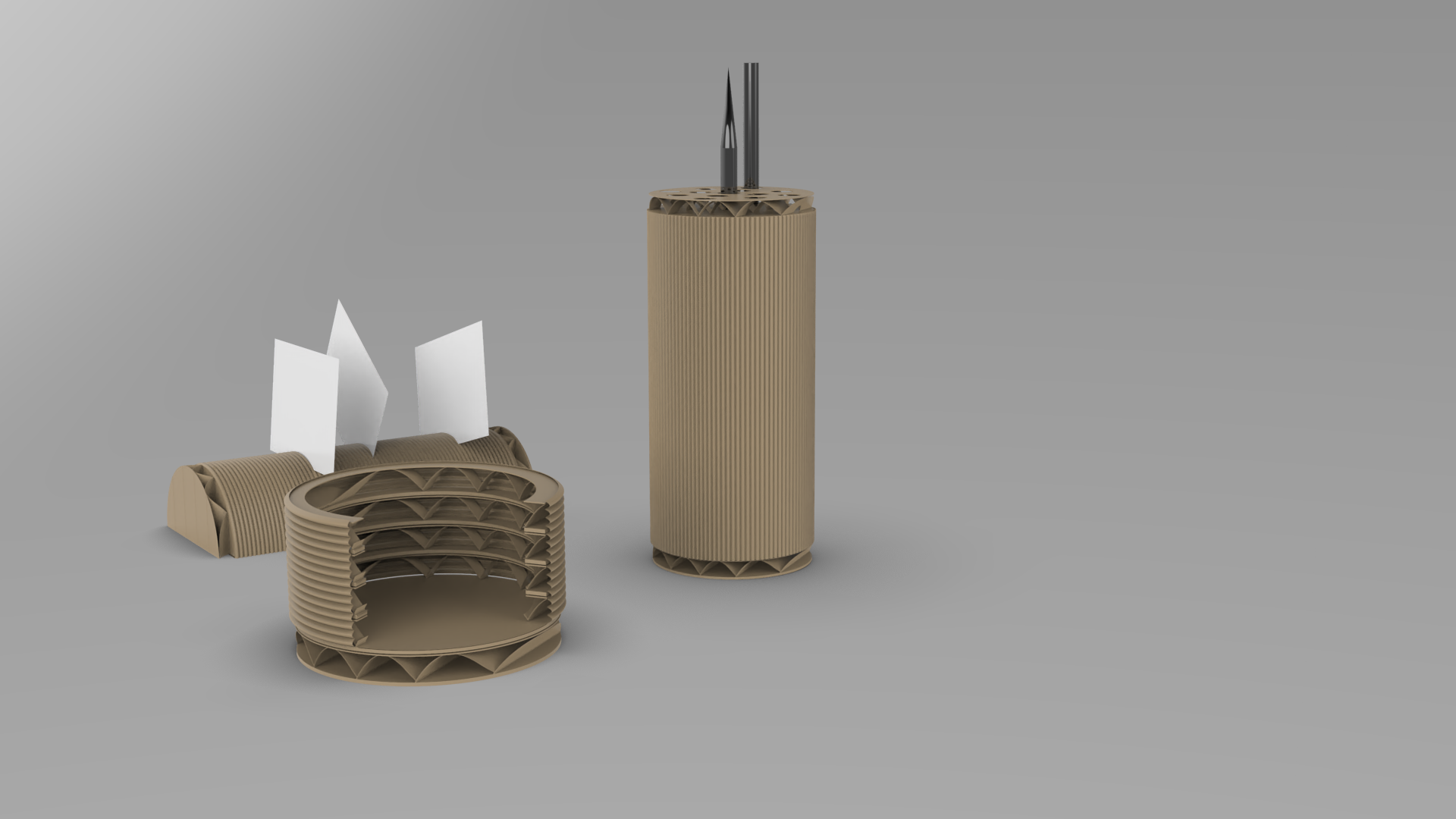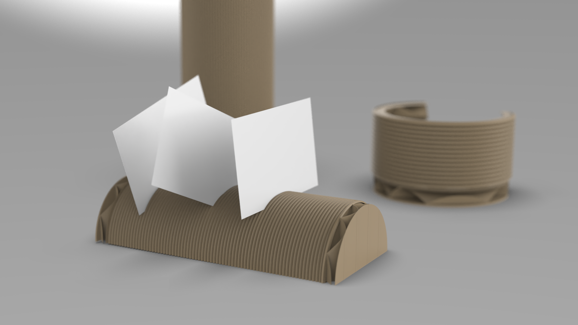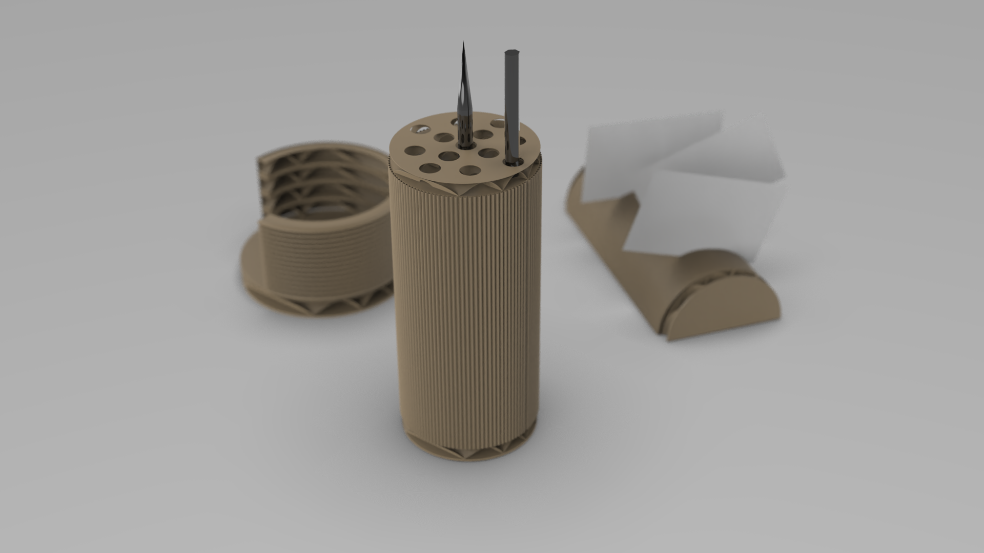 Sada tří doplňků na pracovní stůl obsahuje držák na psacípotřeby, stojan na papírové bločky a držák na vizitky. Sada flat pack je navržena tak, aby byl každý schopen z jednotlivých dílů poskládat výsledný produkt.