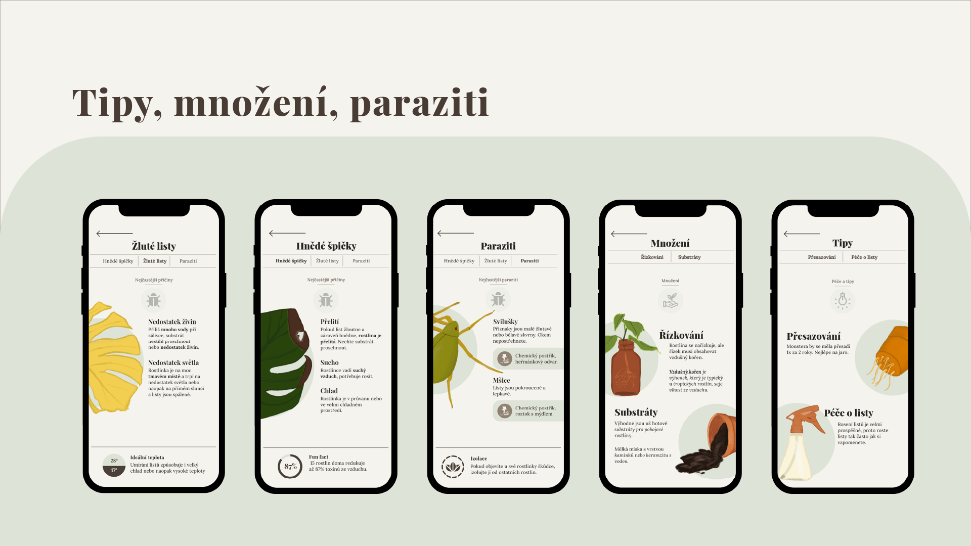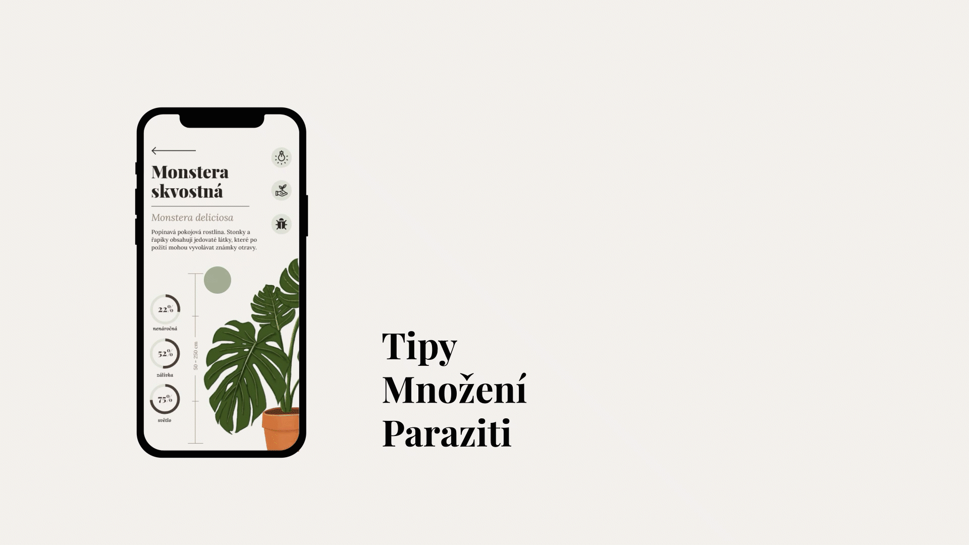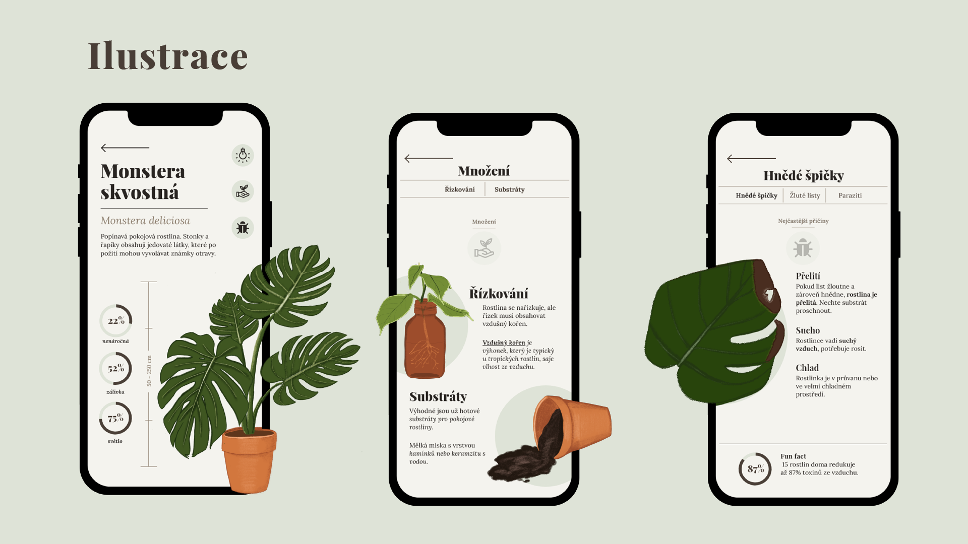 Cílem mé webové aplikace bylo vytvořit "cheatsheet" pro rostlinky. Tahák, kde jsou všechny základní potřeby pro pokojovou rostlinu. Dominantou aplikace jsou ilustrace.