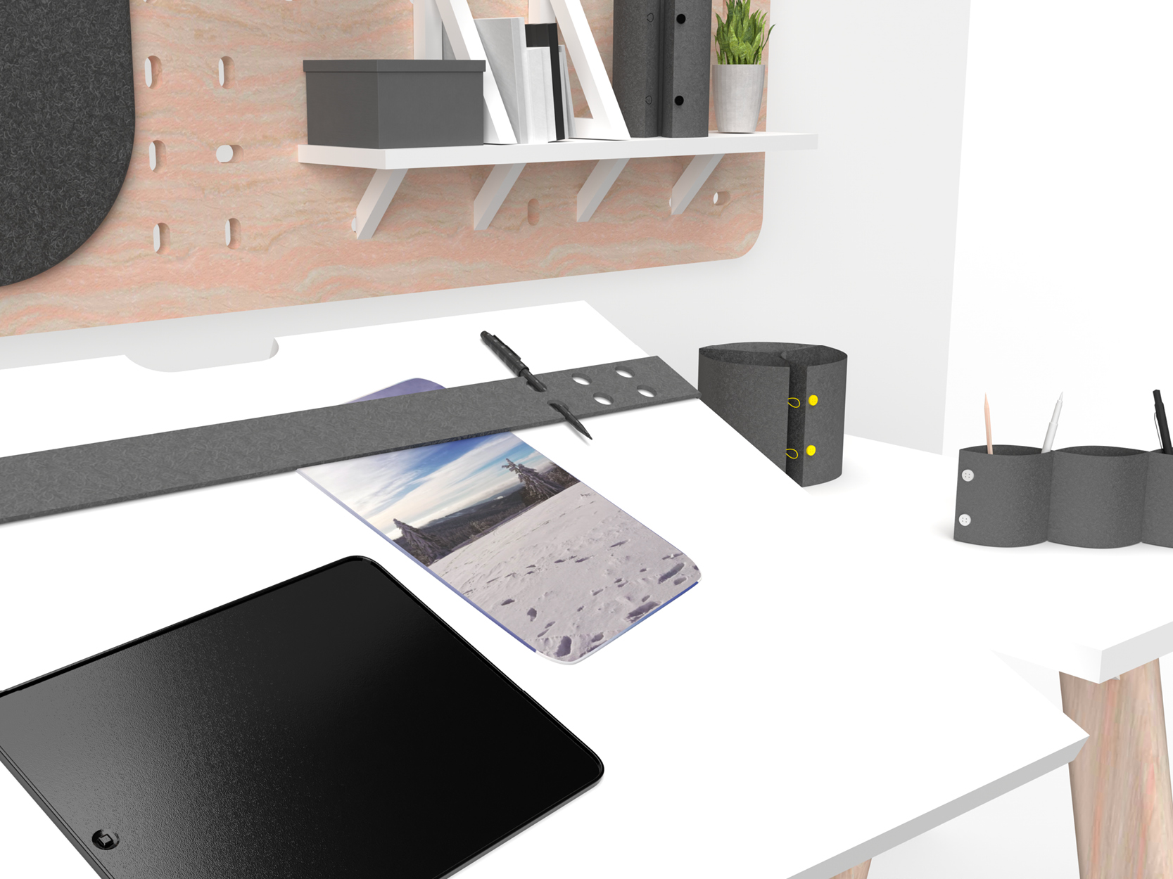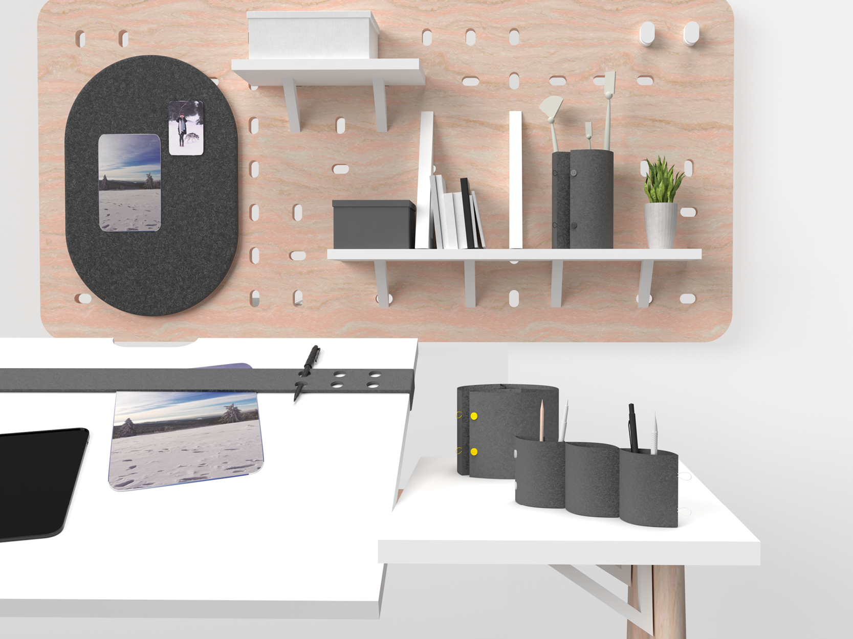 Set obsahuje nástěnku na nástěnný úložný systém pro připnutí nejdůležitějších myšlenek a úkolů, pás na výklopnou desku stolu pro zachycení tužek, papírů nebo knížek a tři velikosti stojánku na psací a umělecké potřeby.