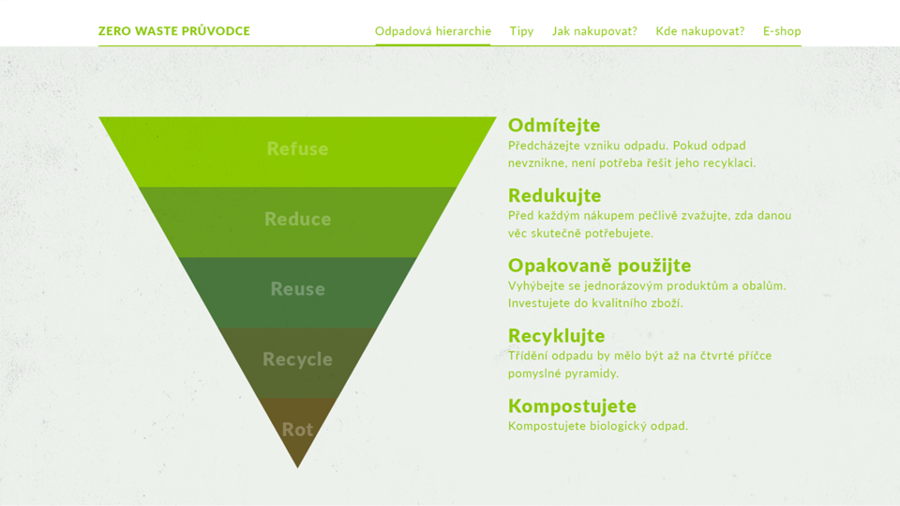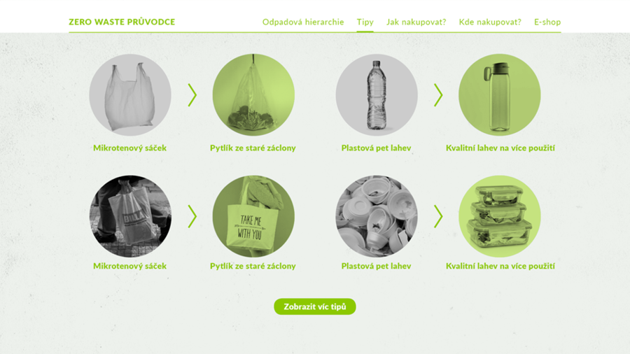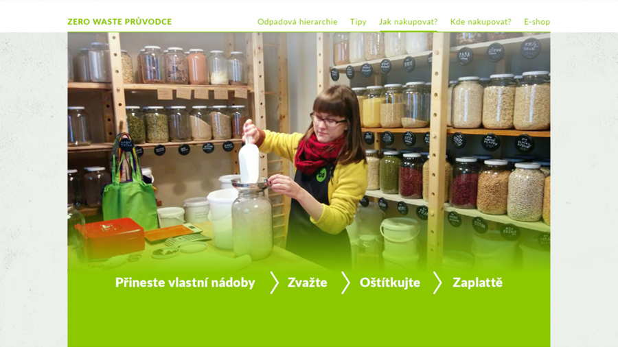V souvislosti tímto zadáním jsem se zabývala zero waste. Vymyslela jsem dárkový balíček se základní výbavou pro odstartování tohoto životního stylu a navrhla jsem webového průvodce bezobalovým nakupováním (nejen) potravin.