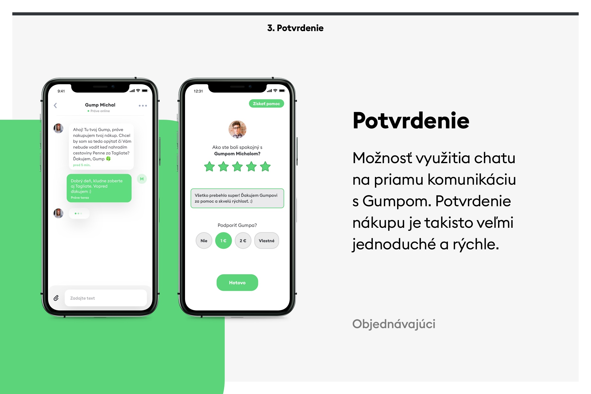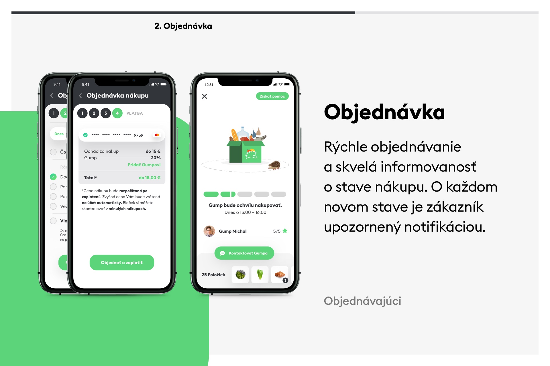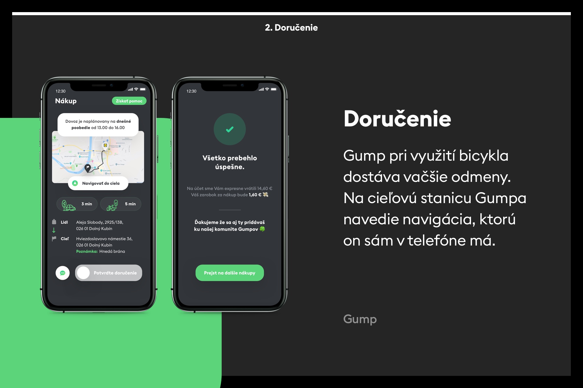 Vyriešený problém je jasný, nákup a dovoz potravín. Potraviny teraz môže nakupovať a roznášať uplne každý a to po rovno všade po svete. Aplikácia Gump však v prvom rade upevňuje vzájomnú pomoc, nakoľko je to prínosne pre obe zúčastnené strany. Potrebná je len aplikácia a obchod v okolí. V obchodoch môžete nájsť aktuálnu ponuku produktov, ale takisto aj akciové produkty. Nachádzať sa tam môžu lacné potraviny pred zárukou, alebo potraviny zadarmo pred vyhodením. Takéto produkty môžu byť roznesené Gump-om sociálne slabším. Riešenie je ideálne ako cez, tak aj po korona kríze. Jeho jednoduché spracovanie dovoľuje uživateľom duplikovať svoj nákupný zoznam a stráviť tak nákupom potravín s platbou menej ako 1 minútu. Nemusí pritom príjsť k žiadnému osobnému kontaktu a nákup bude doručený priamo k dverám. Aplikácia využíva funkcie obľúbených potravín, často nakupovaných potravín alebo predvyrobených nákupných zoznamov.