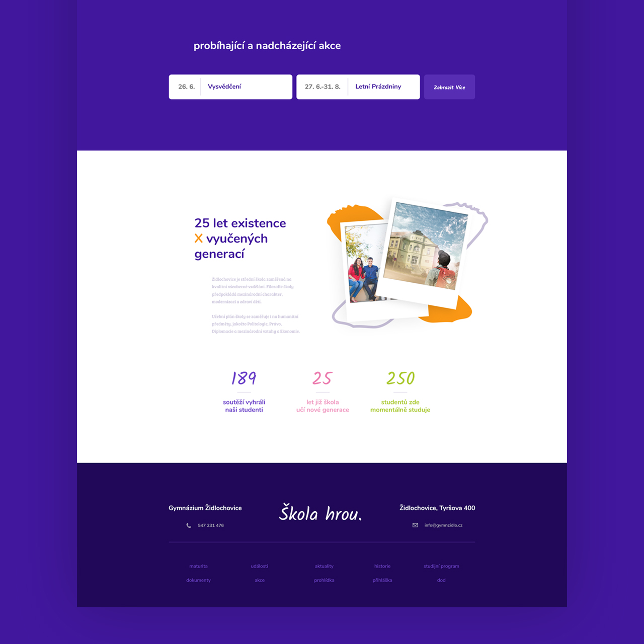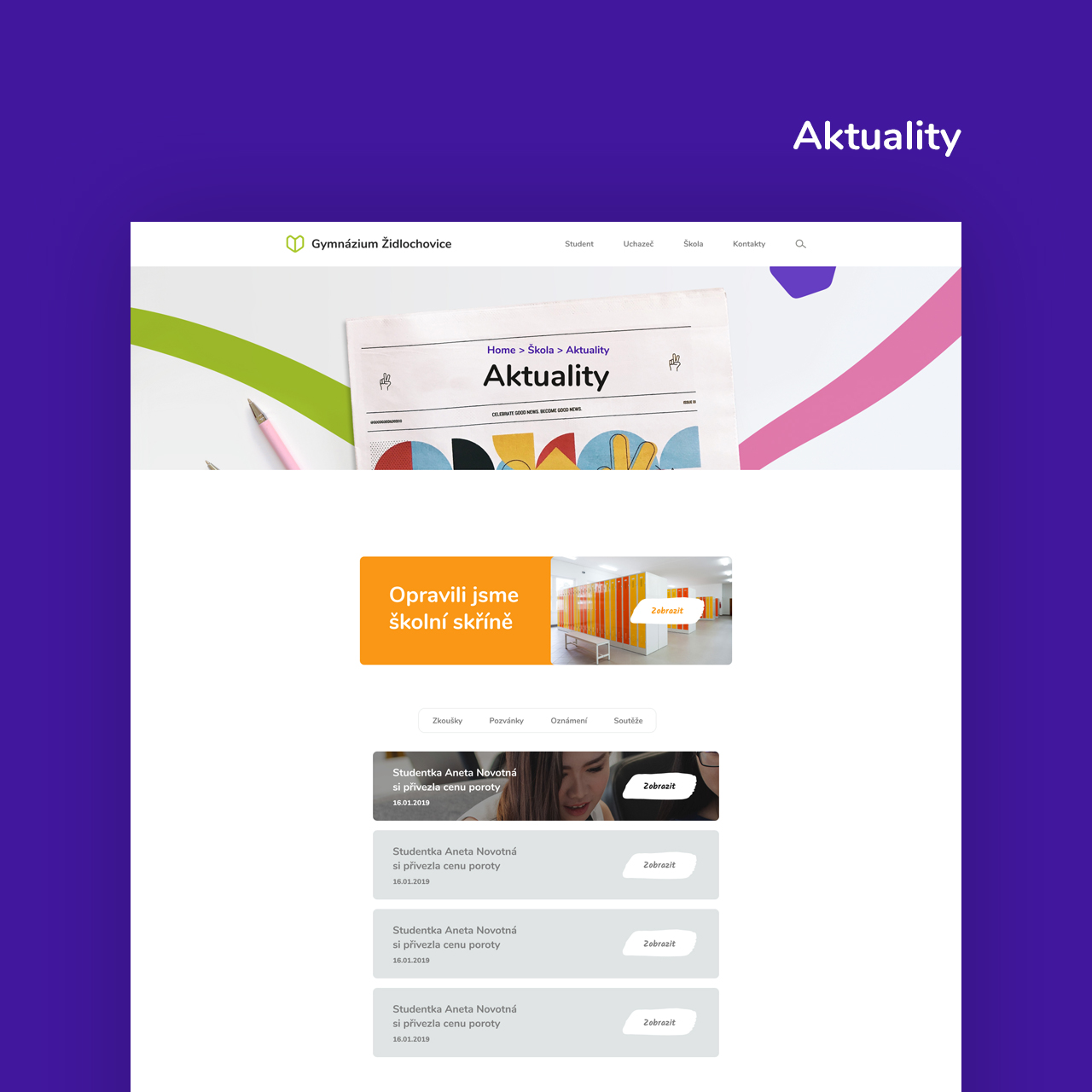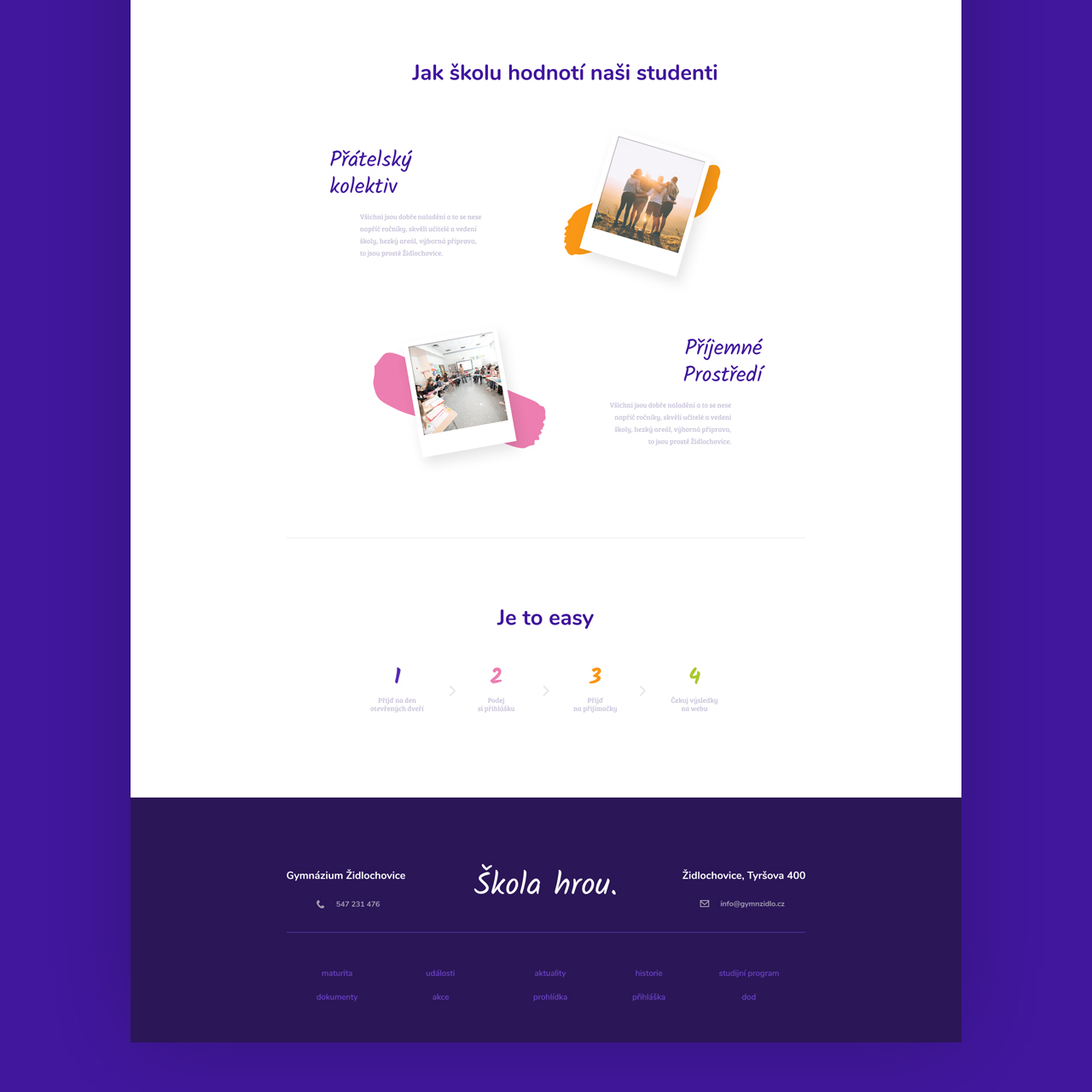 Cílem bylo vytvořit novou webovou prezentaci společně s vizuálním stylem pro Gymnázium Židlochovice. Vytvořil jsem 5stránkový prototyp webu včetně mobilní responzivní verze. Outlinové logo vychází z tvaru knihy, přičemž se mění ve tvar srdíčka, tím jsem chtěl definovat přátelskou atmosféru ve škole.