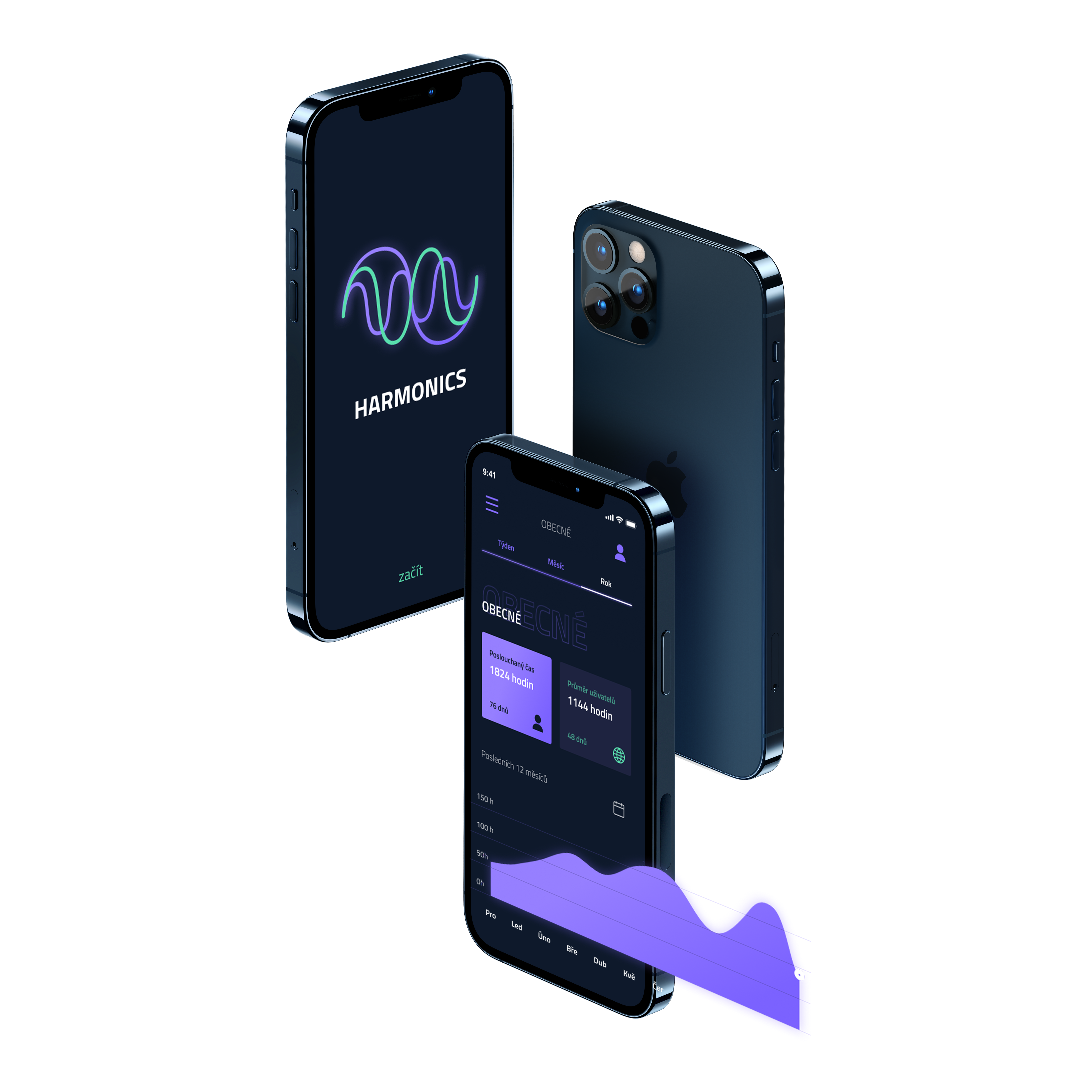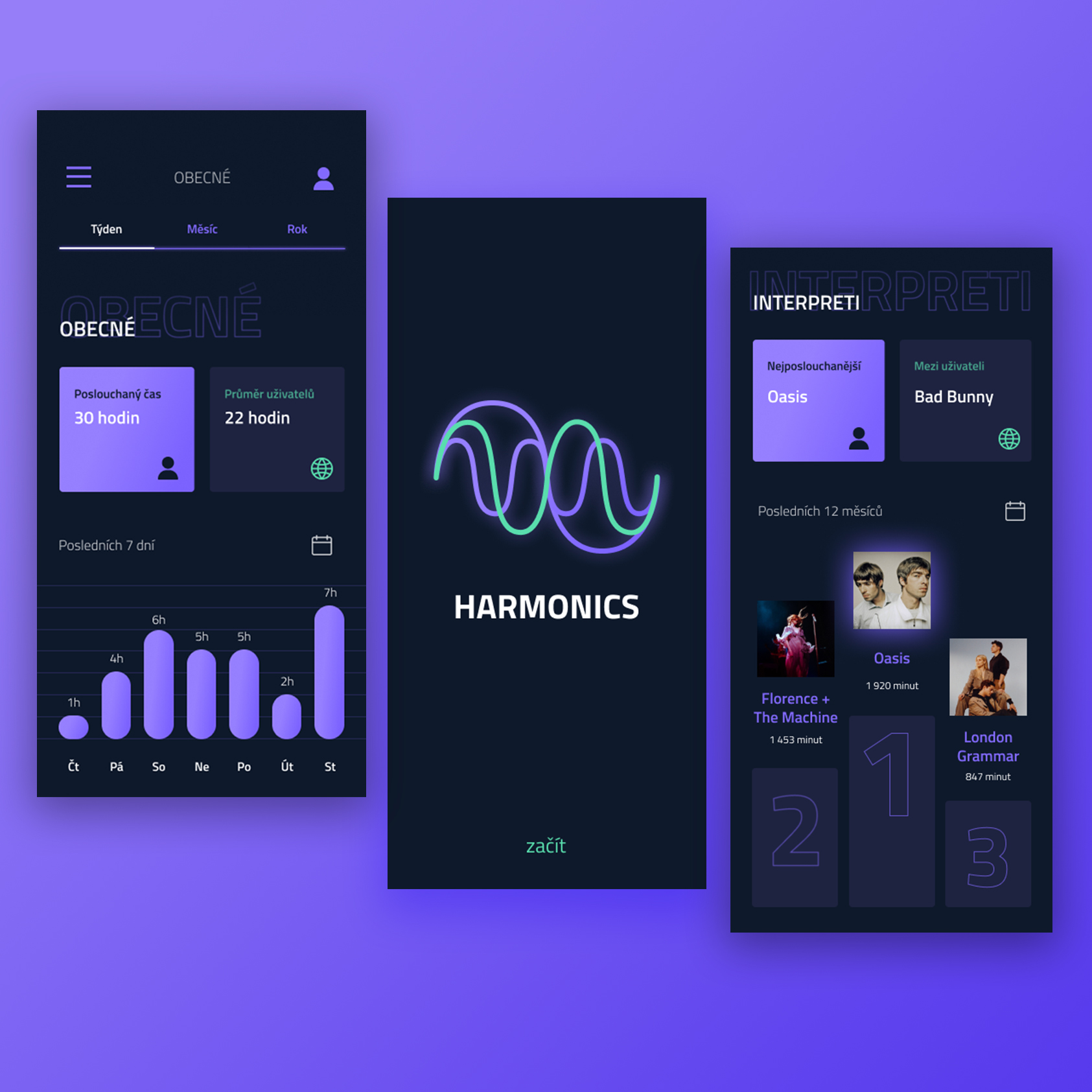 Infografická aplikace zaznamenávající hudební aktivitu na mobilu. Zvolila jsem tmavé pozadí se zářivými barvami jako je modrá a fialová, s tím že každá barva pracuje s rozdílnými daty. Hlavní prvek, podle kterého se uživatelé orientují, je horní lišta měnící časové období a velké tlačítka přepínající statistiky mezi mými a průměrem uživatelů. Chtěla jsem dosáhnout jednoduché přehlednosti a svěžího designu, který by neurazil žádnou věkovou skupinu, protože hudba je populární v každém věku.