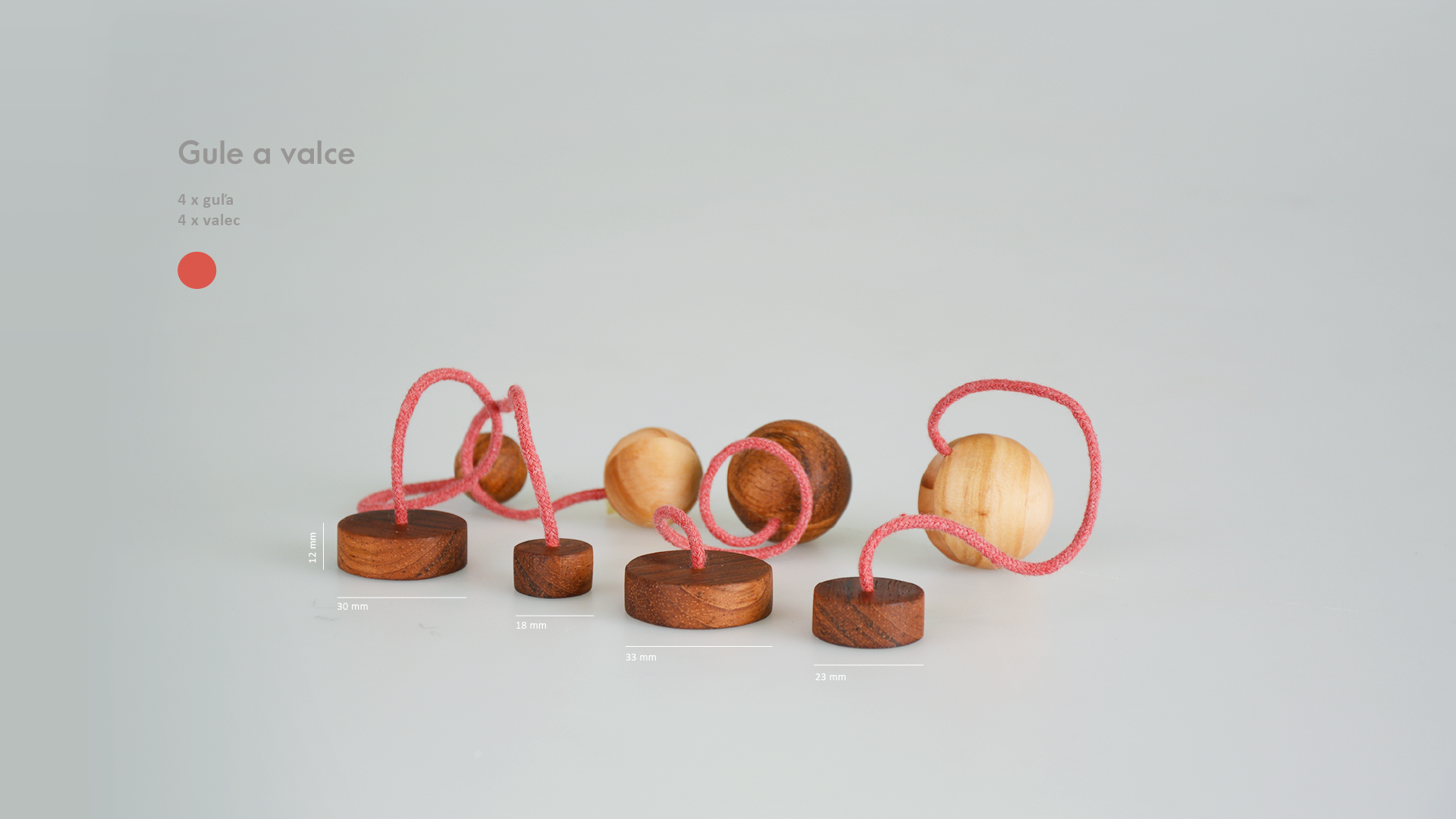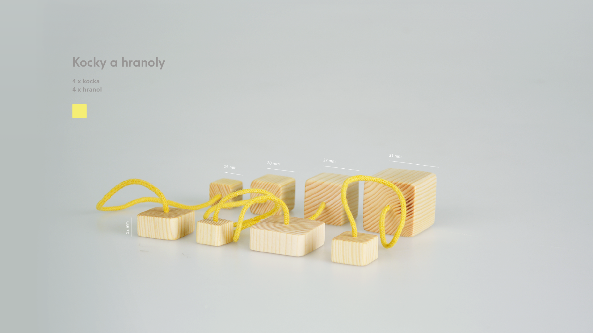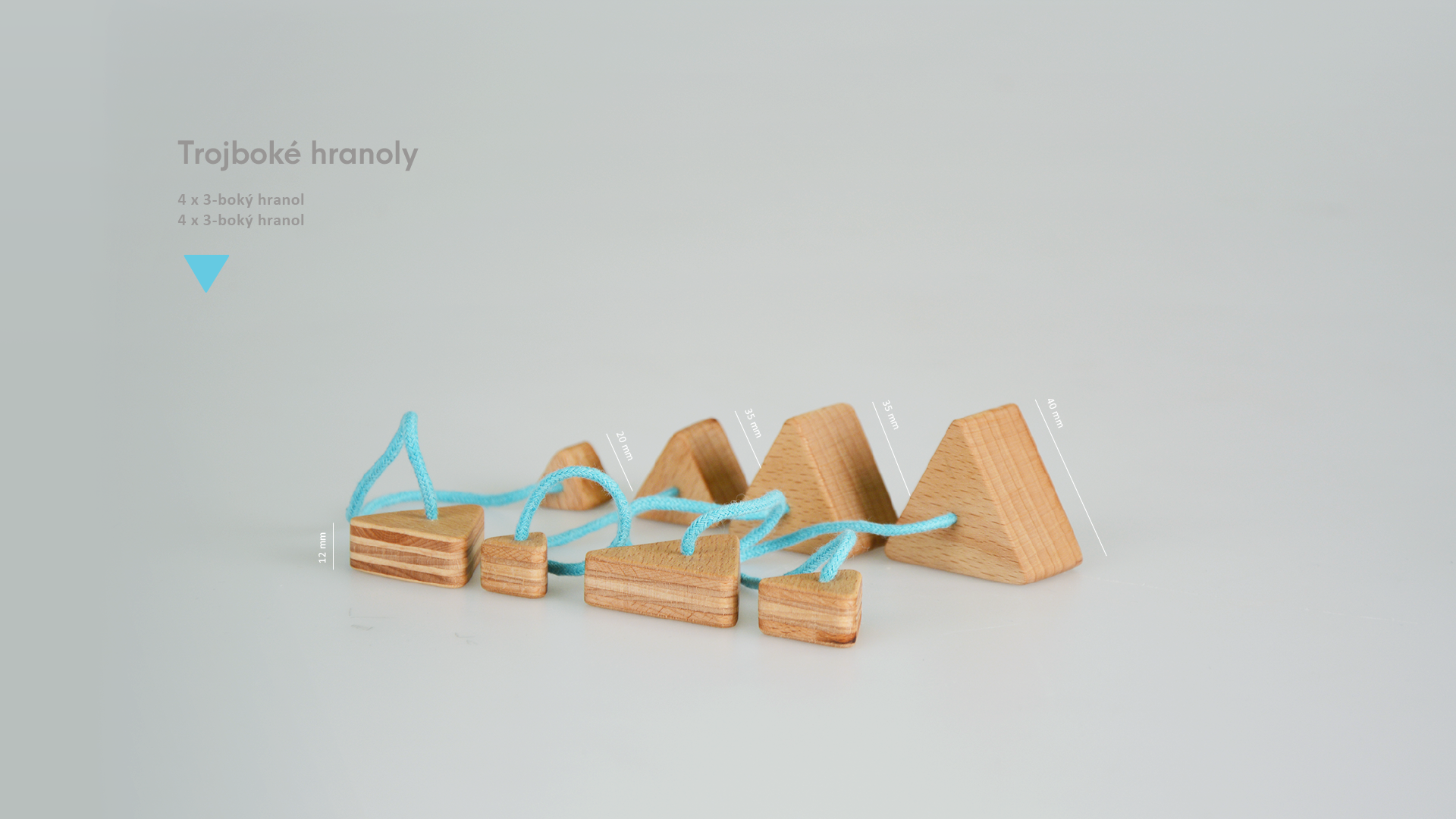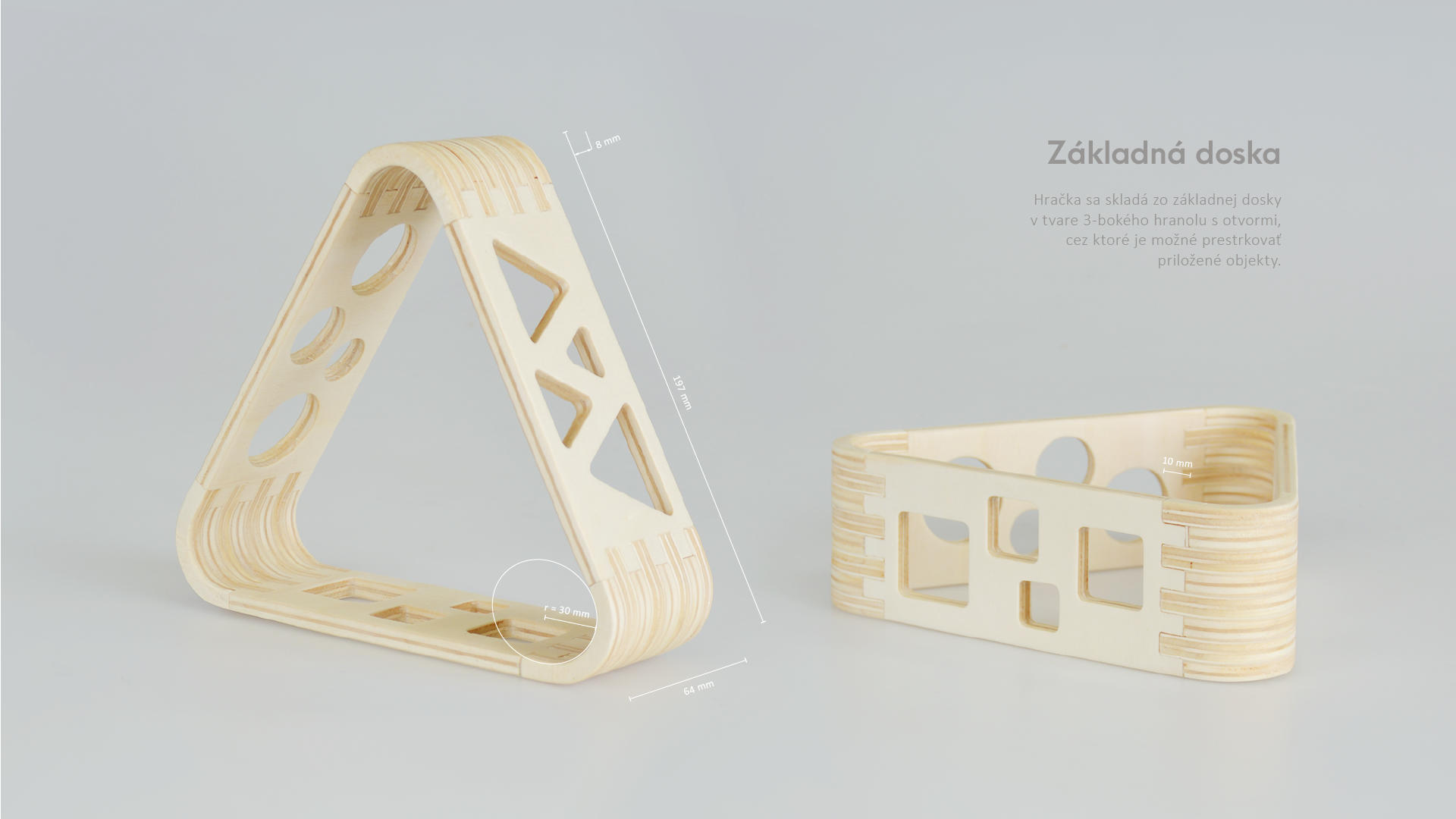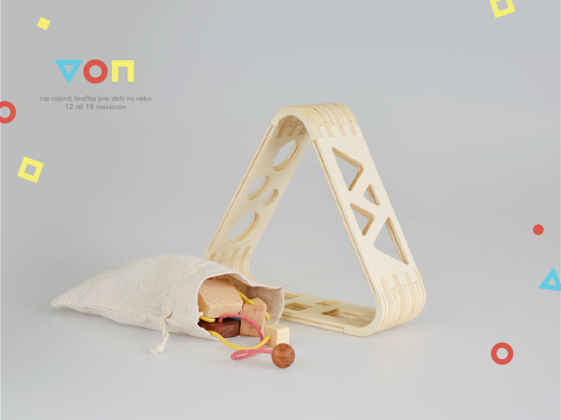 Drevená hračka VON je určená deťom vo veku 12 až 18 mesiacov na rozvoj jemnej motoriky, podporu pamäte a rozpoznávania tvarov a proporcií. Skladá sa zo základnej dosky v tvare 3-bokého hranolu s otvormi a súborom rozličných tvarov spojených šnúrkami do dvojíc. Ako materiál je použitá preglejka, rôzne typy dreveného masívu a farebné bavlnené šnúrky.