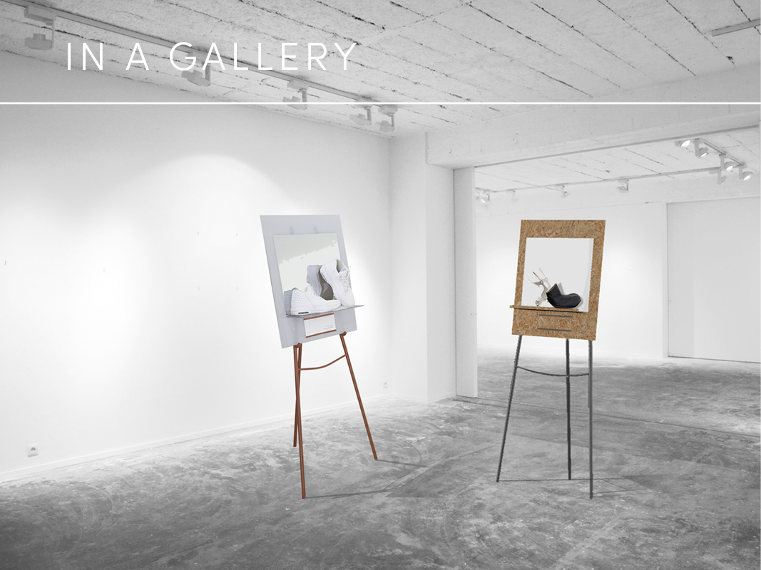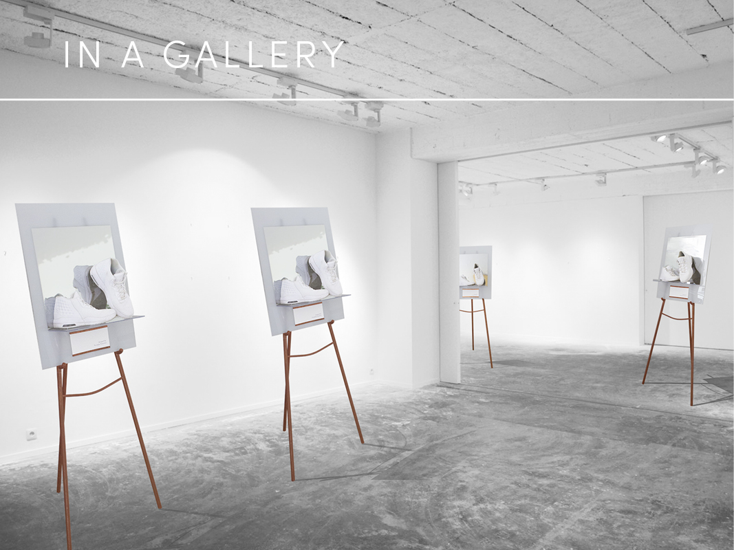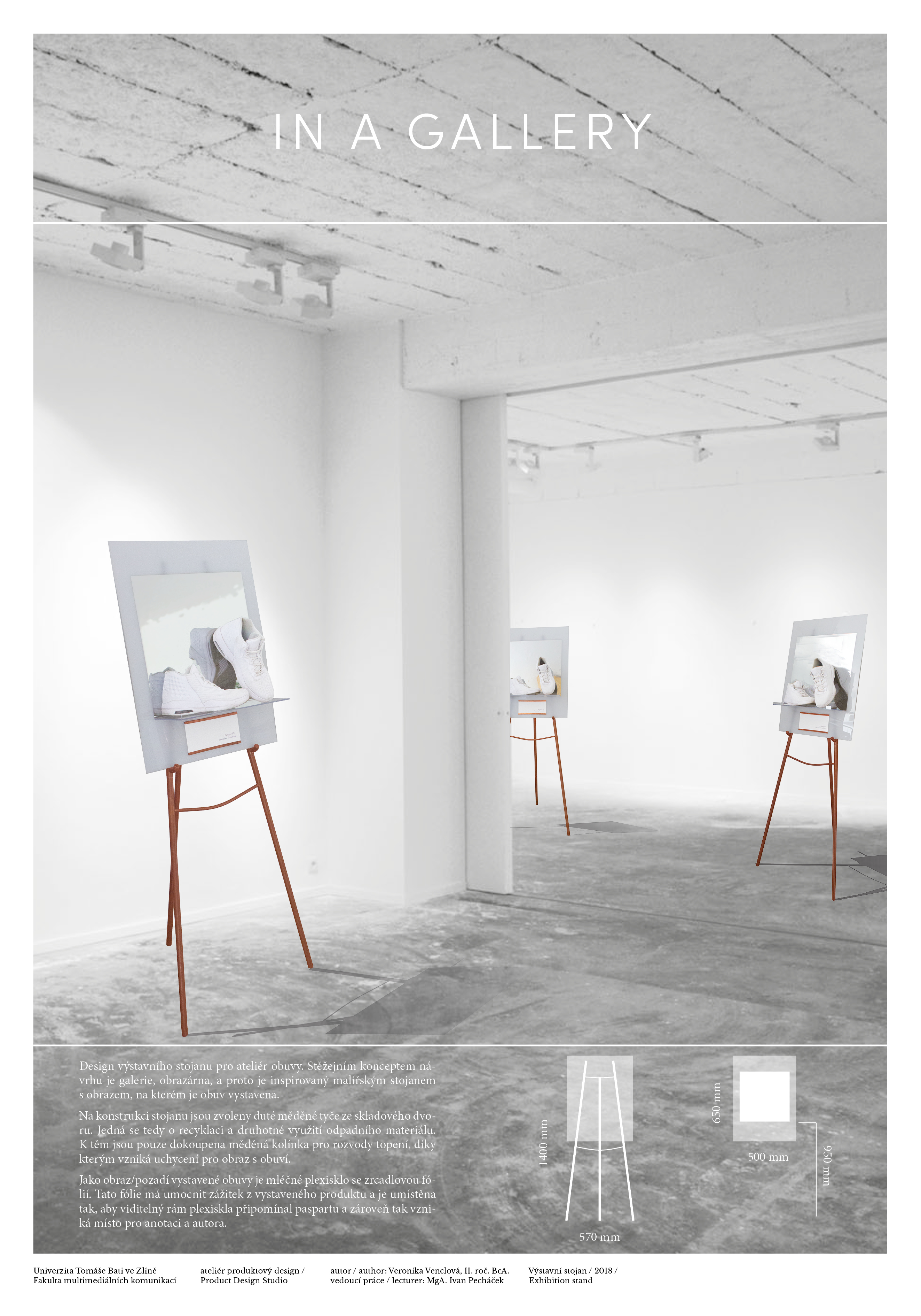 Design výstavního stojanu pro ateliér obuvi. Stěžejním konceptem návrhu je galerie, obrazárna, a proto je inspirovaný malířským stojanem s obrazem, na kterém je obuv vystavena.
