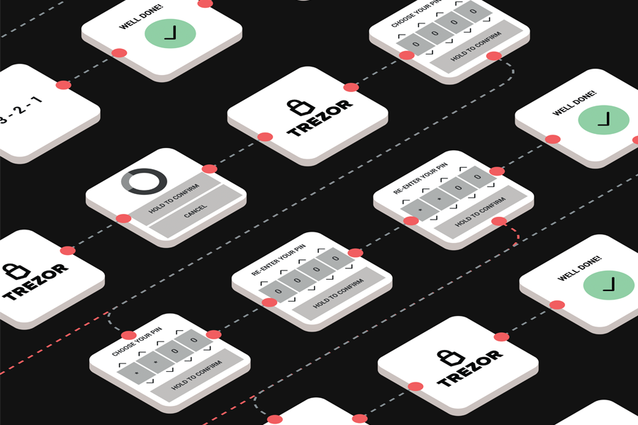 Pri tvorbe vlastnej informačnej architektúry sme sa zamerali na logickú postupnosť jednotlivých krokov a vymedzenia rolí počítača a zariadenia. Celý onboarding proces sme rozdelili do troch častí: inicializácia (kde dochádza k aktualizácií zariadenia), vytvorenie účtu a záloha, ktorú sme oproti predchádzajúcemu riešeniu označili ako dobrovoľnú. Ďalej sme pracovali s konceptom jednotných potvrdzovacích obrazoviek a ich umiestnenia v rámci procesu zavádzania zariadenia. Jednotlivé kroky sme navrhli a usporiadali tak, aby korešpondovali s aktuálne používanou webovou aplikáciou Trezor Wallet. Výsledkom je pre užívateľa pohodlnejšie a zmysluplnejšie zavedenie nového zariadenia. Zároveň sme znížili počet krokov z pôvodných 26 na 20 a teda proces citeľne skrátili. Vytvorenie logickej štruktúry a vzájomnej nadväznosti obsahu celého procesu nám dalo správny smer pre vytvorenie základného wireframu. Jeho vizualizácia nám pomohla riešiť predtým nepovšimnuté problémy ako rozmiestnenie funkčných prvkov, kľúčových textov či tlačidiel. V tomto procese sme sa rozhodli vyriešiť i chybné kroky postupu inicializácie a teda pridali sme ich riešenie do hotového konceptu. Navigáciu uživateľa sme založili na intuitívnej komunikácii tlačidiel a obsahu. Zadávanie a opakovanie pinu sme radikálne zmenili - odstránili sme potrebu klávesnice. Zároveň sme urýchlili samotný proces a vylepšili jeho zabezpečenie v prípade neželaného sliediča.