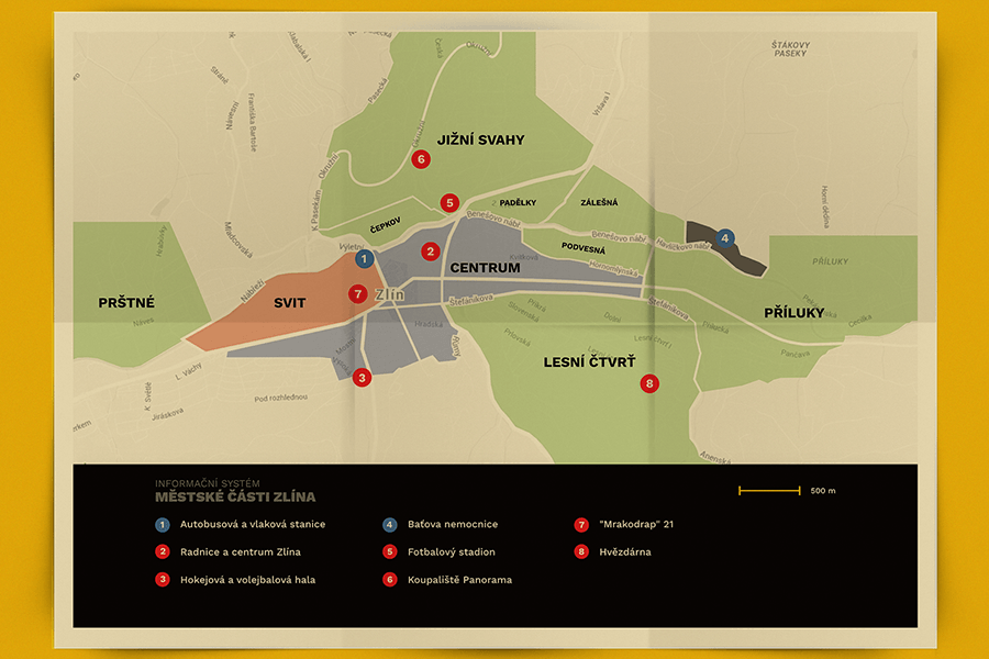 Návrh informačních map pro návštěvníky Zlína. První návrh seznamuje návštěvníka se Zlínskými čtvrtěmi a zajímavými a důležitými místy města. Návrh druhý pak zobrazuje zajímavosti a atrakce přímo v městském centru.