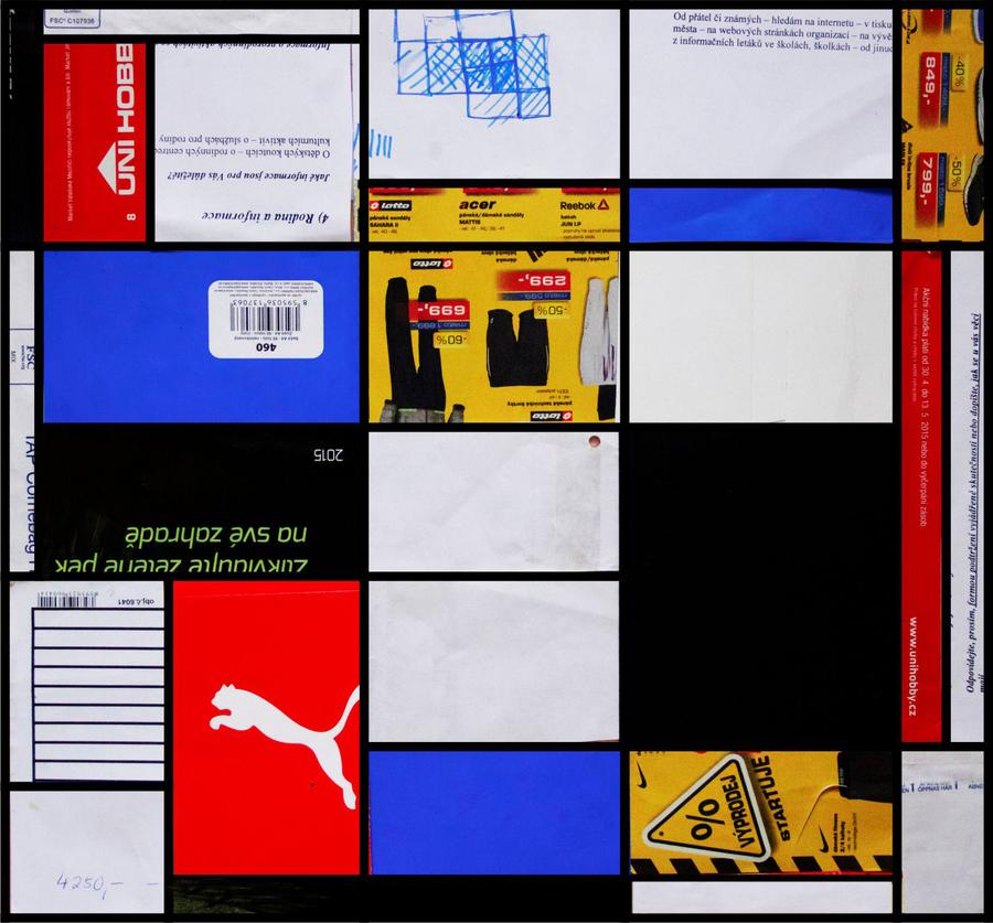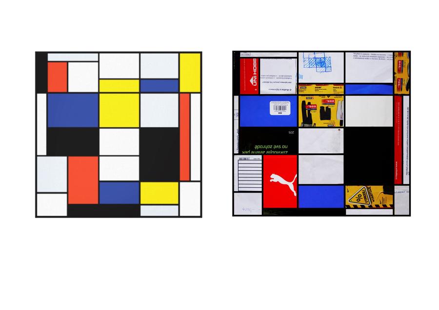 Inspirace Mondrianem, využití odpadového materiálu - papíru a následná finální editace v pc.
