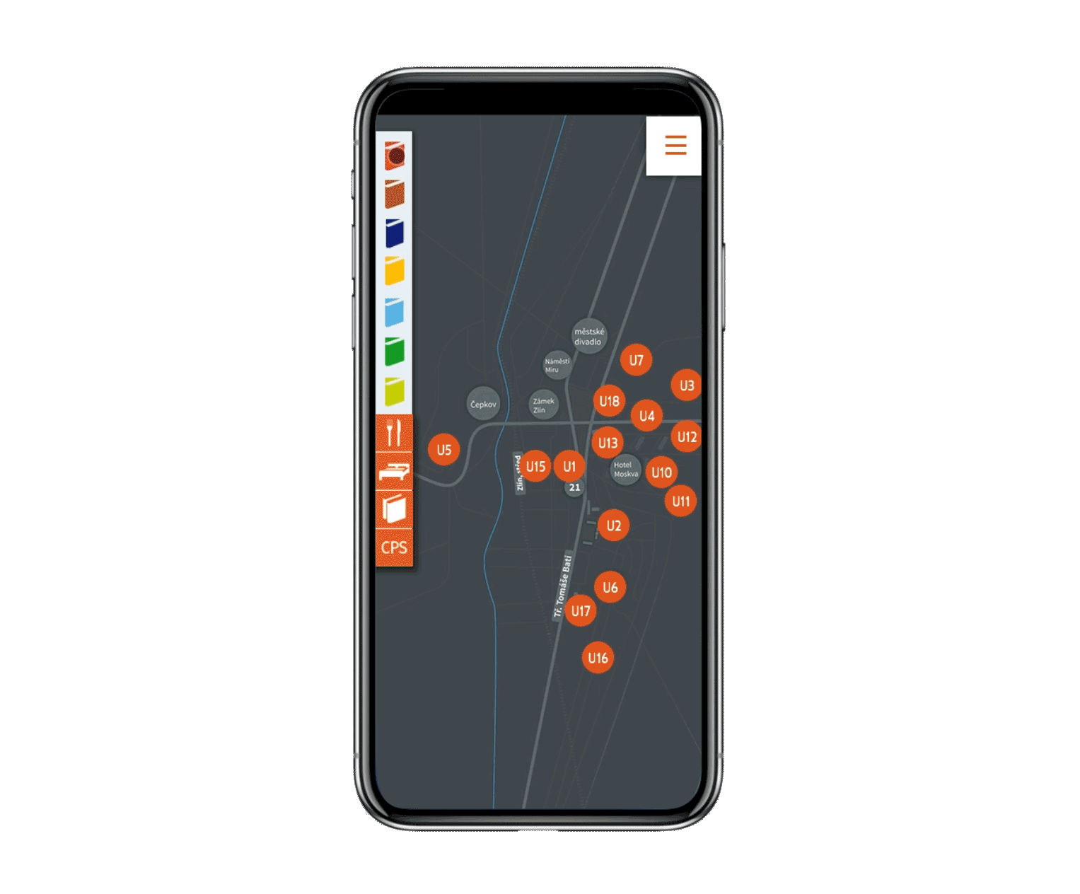 Interaktivní mapa je složena ze tří částí: menu, boční zobrazovací lišta, a samotná mapa