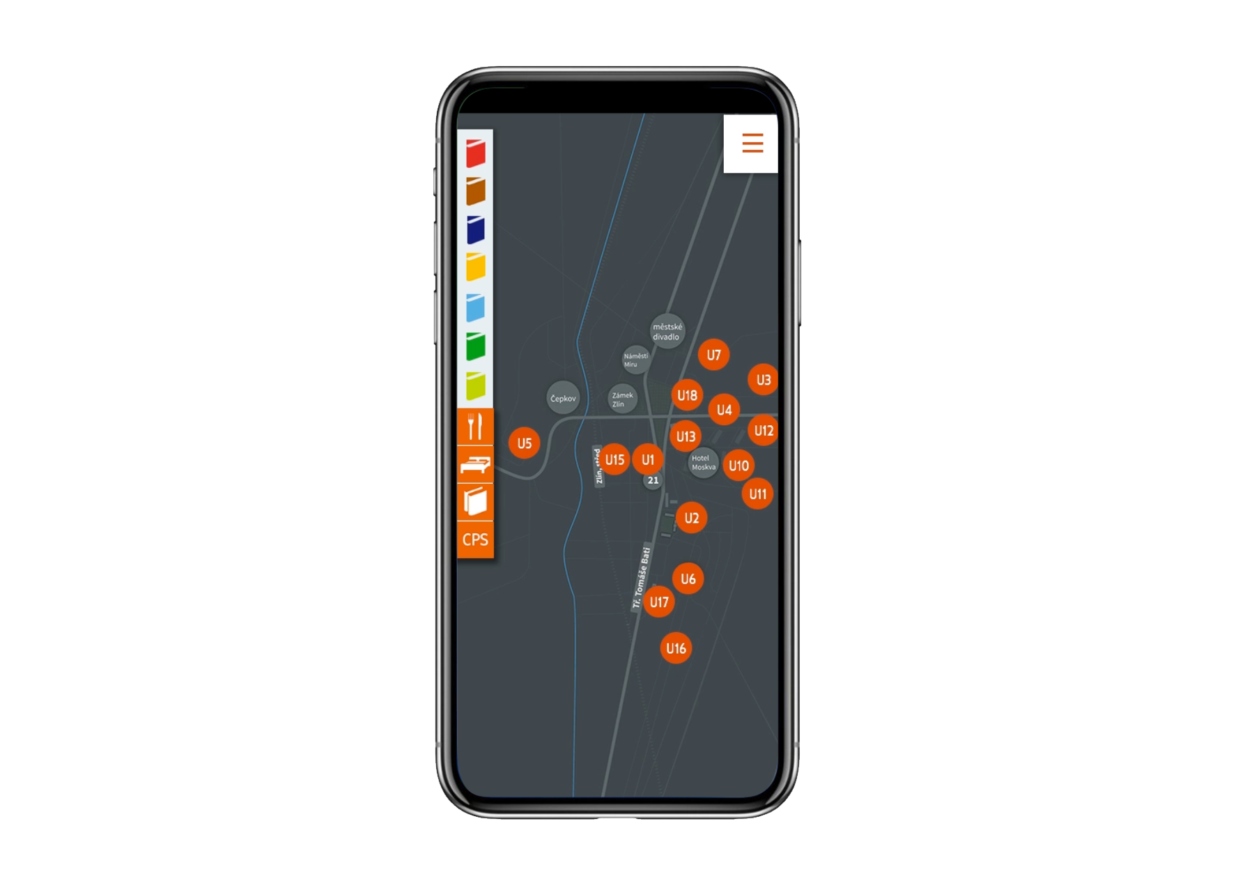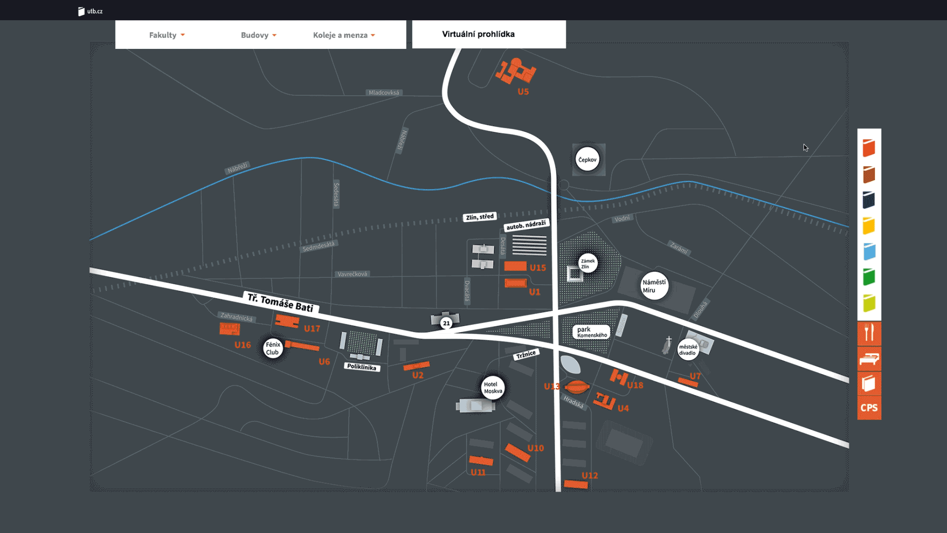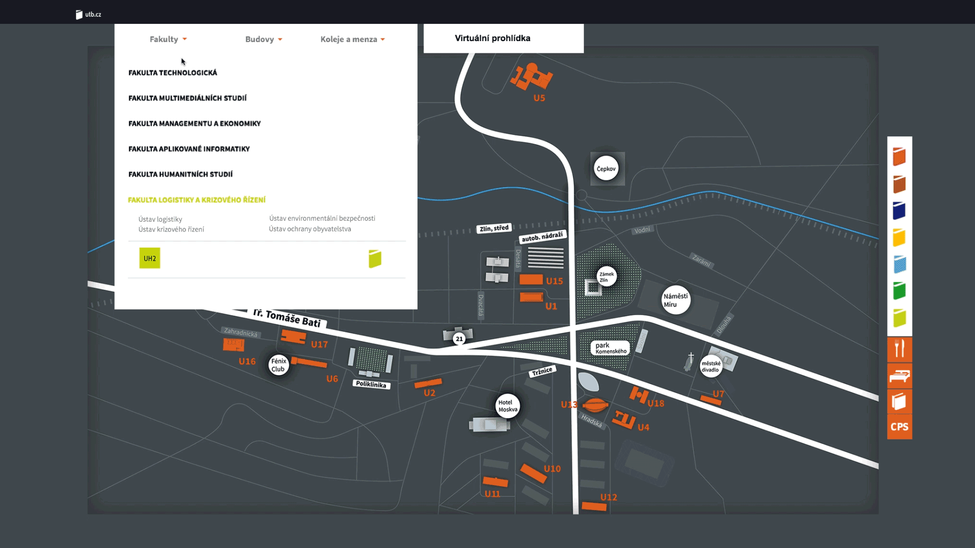 Samotná mapa má na sobě budovy, které při najetí myši zobrazí veškeré informace spojené s budovou (informace, web, trasu google atp.)