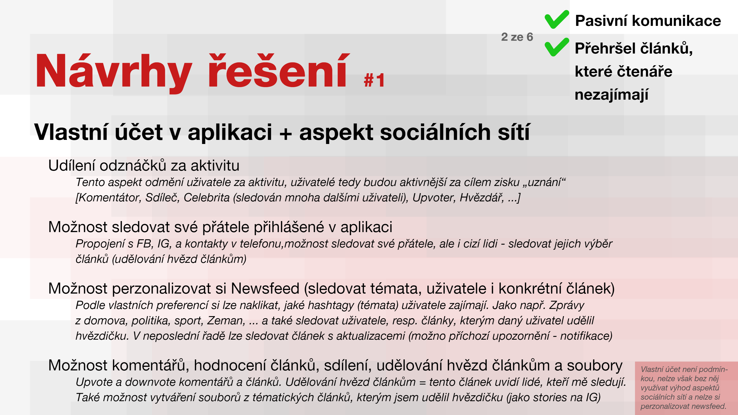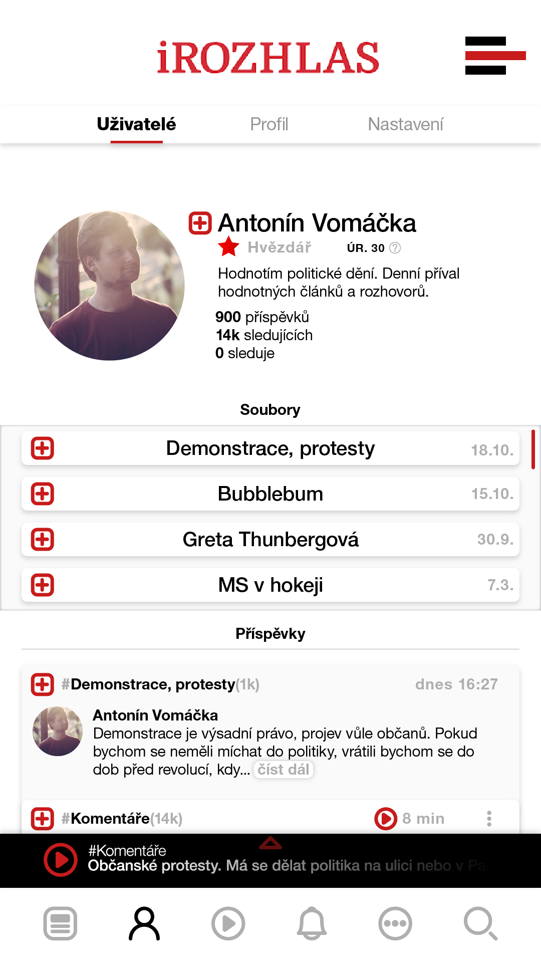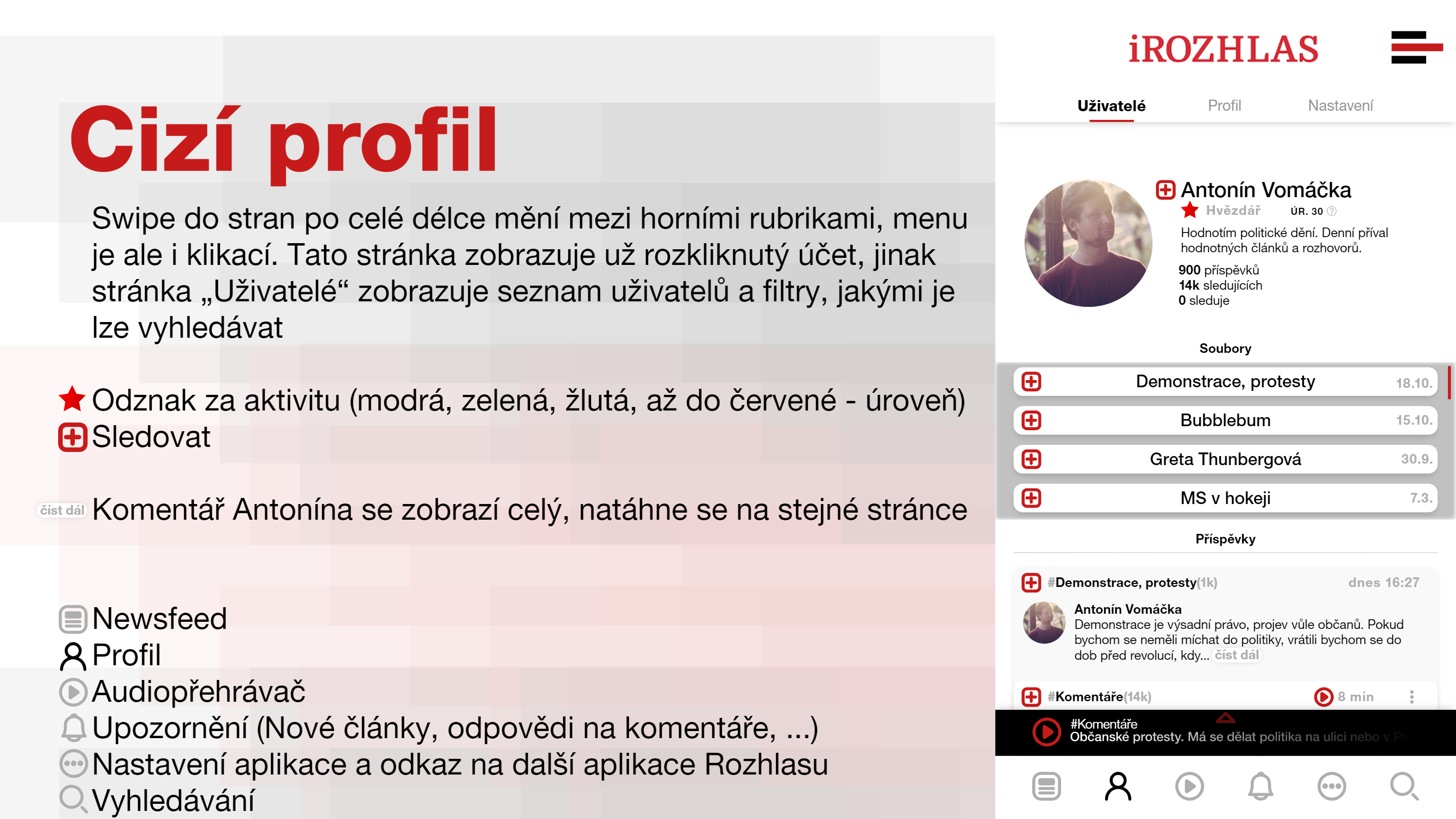 Možnost sledování přátel z jiných sociálních sítí, sledování témat a jiných uživatelů, kteří budou na svém profilu sdílet a komentovat články.