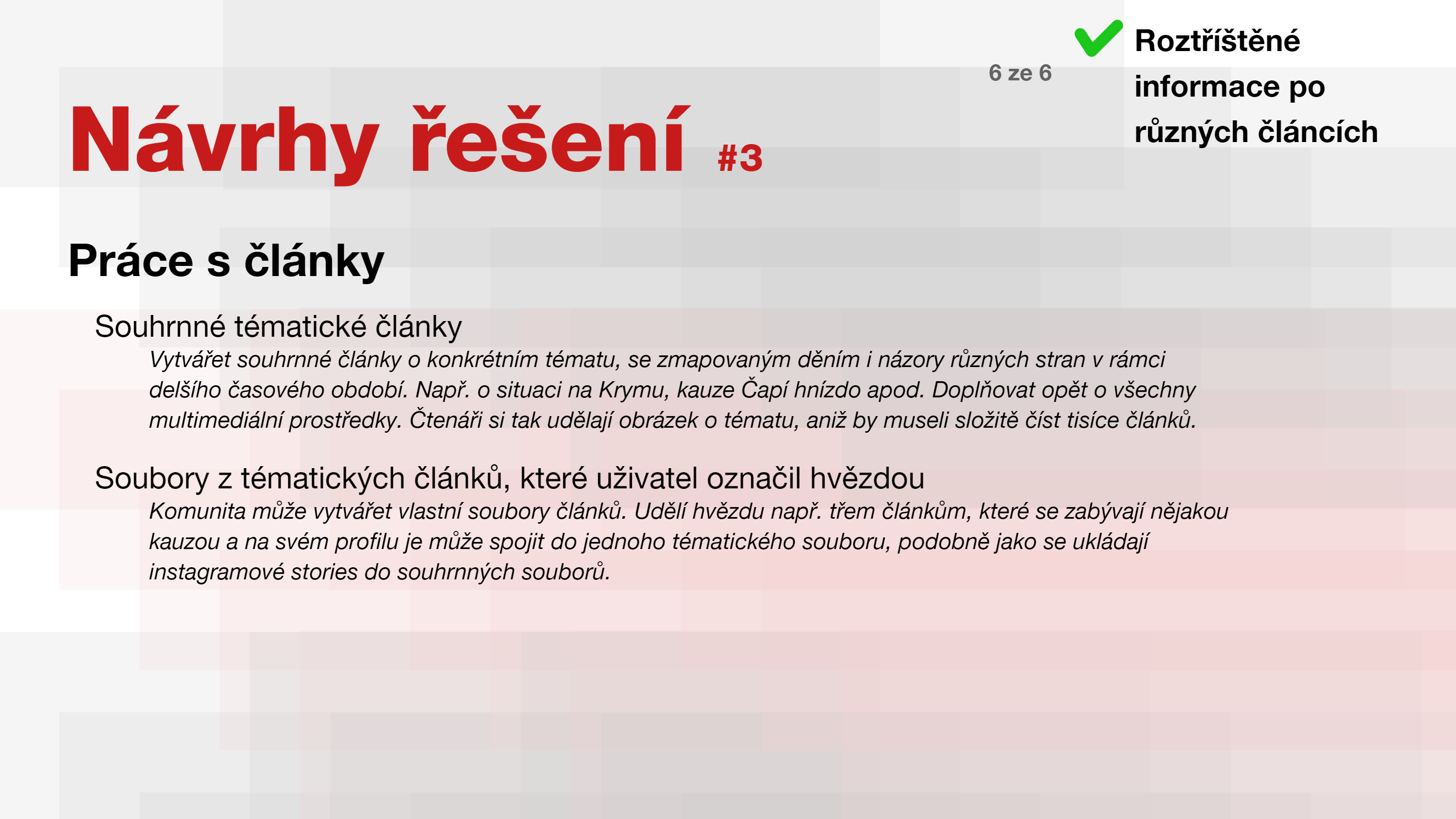 Personalizace feedu za pomocí sledování hashtagů, témat a konkrétních uživatelů. Všechny články k dispozici zároveň i jako audiostopa s přehrávačem.