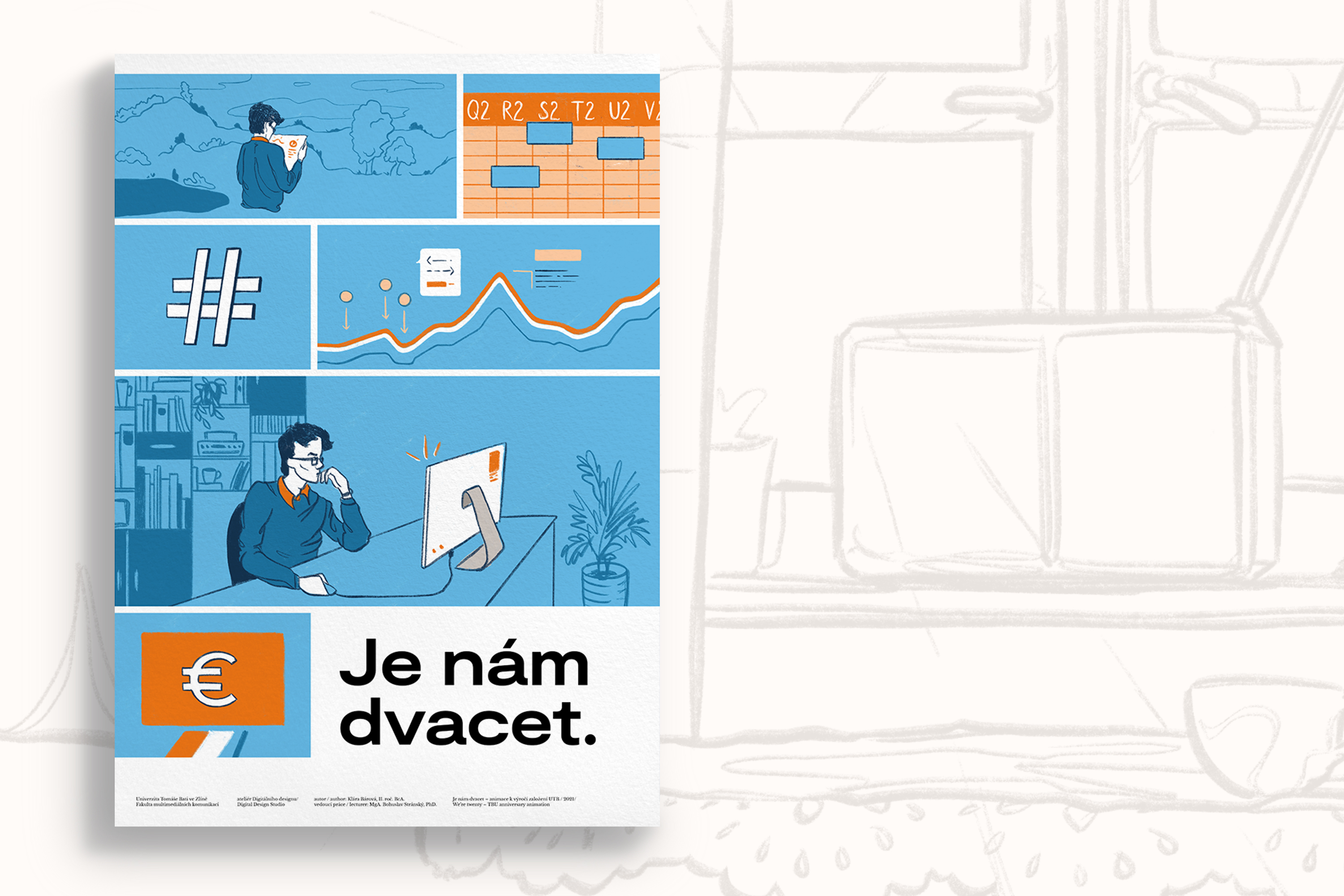 Klauzurní práce k výročí založení Univerzity Tomáše Bati ve Zlíně se sloganem „Je nám dvacet.“. S kolektivem autorů jsme se rozhodli zpracovat toto téma jako sérii animací, z nichž každá reprezentuje některou z fakult nebo součástí univerzity. Jednotlivé animace jsme spojili v jedno video a doplnili jej o data založení, hudbu a zvukové efekty. Součástí videa je také společná část úvodu, na němž se podílel každý z tvůrců ve svém zvoleném osobitém stylu. Jednotícím prvkem animace bylo použití univerzitní oranžové barvy v každé scéně a použitý font. Spolupráce se pak promítla hlavně v přechodech jednotlivých snímků, ty autoři vytvářeli spolu, s návazností na příběhy a tak, aby vznikl kompromis mezi jednotlivými storyboardy.