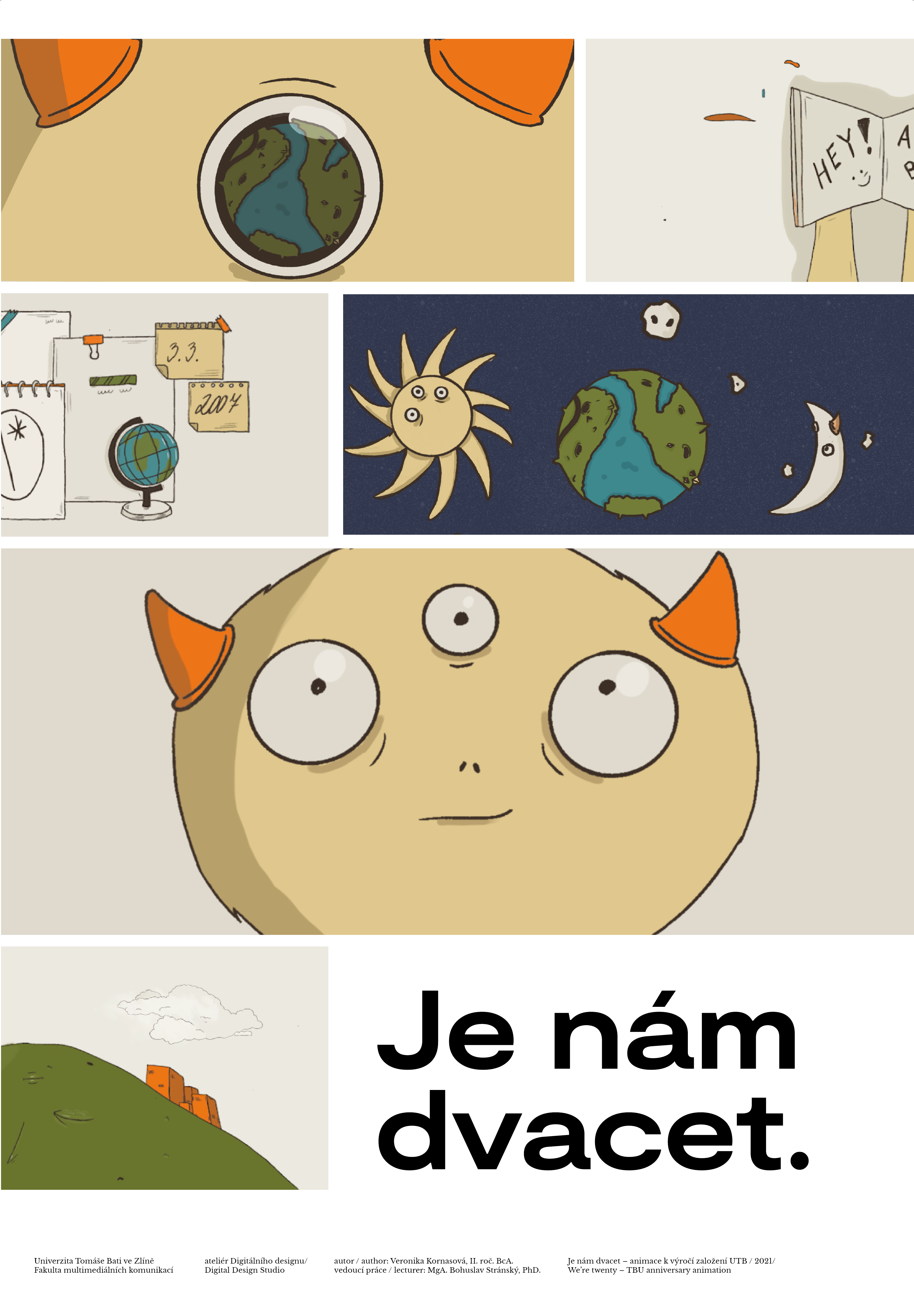 Klauzurní práce k výročí založení Univerzity Tomáše Bati ve Zlíně se sloganem „Je nám dvacet.“. S kolektivem autorů jsme se rozhodli zpracovat toto téma jako sérii animací, z nichž každá reprezentuje některou z fakult nebo součástí univerzity. Jednotlivé animace jsme spojili v jedno video a doplnili jej o data založení, hudbu a zvukové efekty. Součástí videa je také společná část úvodu, na němž se podílel každý z tvůrců ve svém zvoleném osobitém stylu. Jednotícím prvkem animace bylo použití univerzitní oranžové barvy v každé scéně a použitý font. Spolupráce se pak promítla hlavně v přechodech jednotlivých snímků, ty autoři vytvářeli spolu, s návazností na příběhy a tak, aby vznikl kompromis mezi jednotlivými storyboardy.