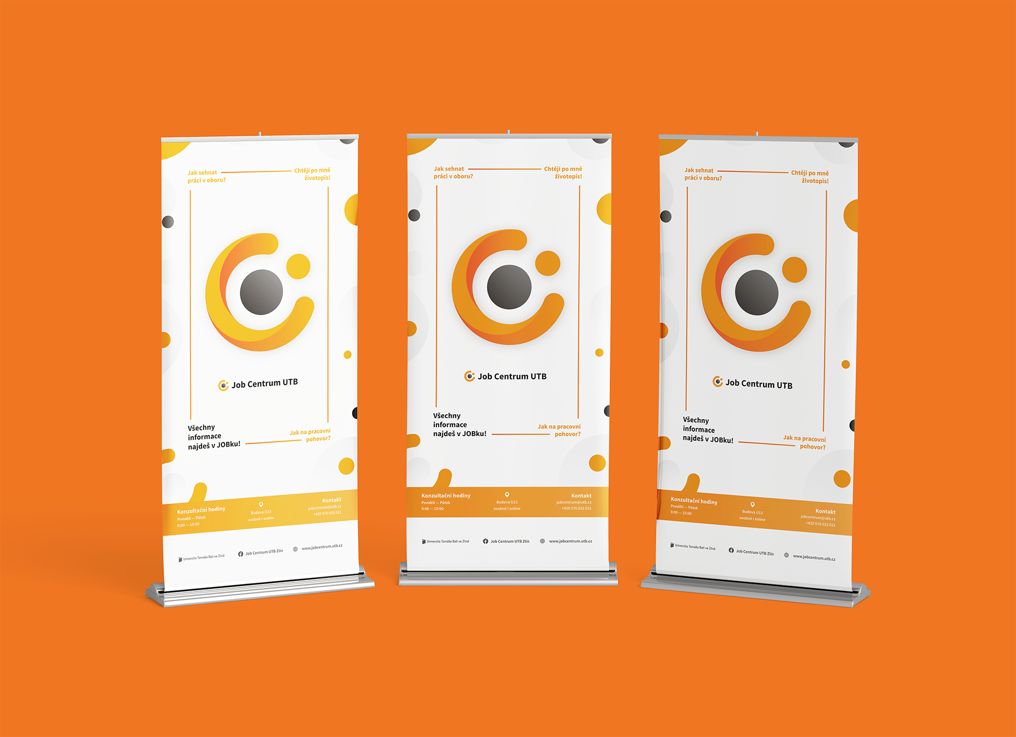 Nová vizuální identita Job Centra UTB je postavená na moderním a jednoduchém vzhledu s hlavní oranžovou barvou univerzity. Nejvíce důležitá věc je nové logo, které mírně vychází ze starého, kde můžeme vidět šipky značící koloběh. V logu je také schované písmeno J, v negativním prostoru písmeno C a uprostřed najdeme terč do černého. Logo funguje dále jako zapamatovatelný symbol pro okolí, které časem začne být spojováno se samotným Job Centrem UTB. K celé vizuální identitě byl i vytvořen web a portal pro studenty, kde si mohou najít práci, stáž a nebo brigádu.
