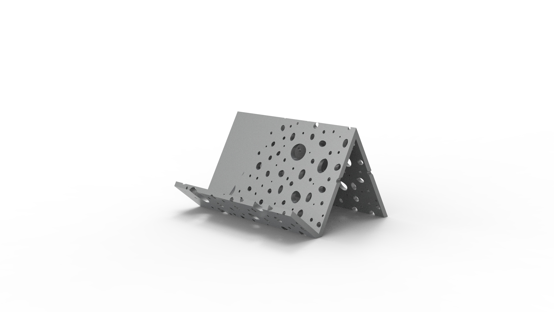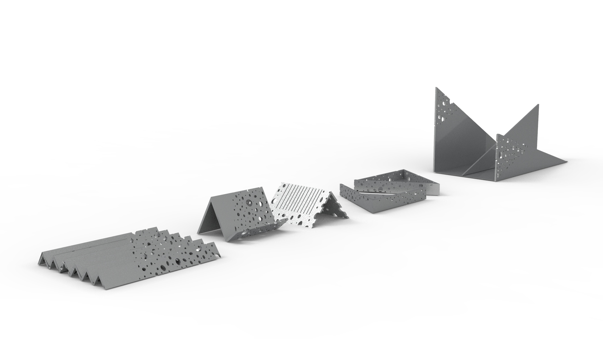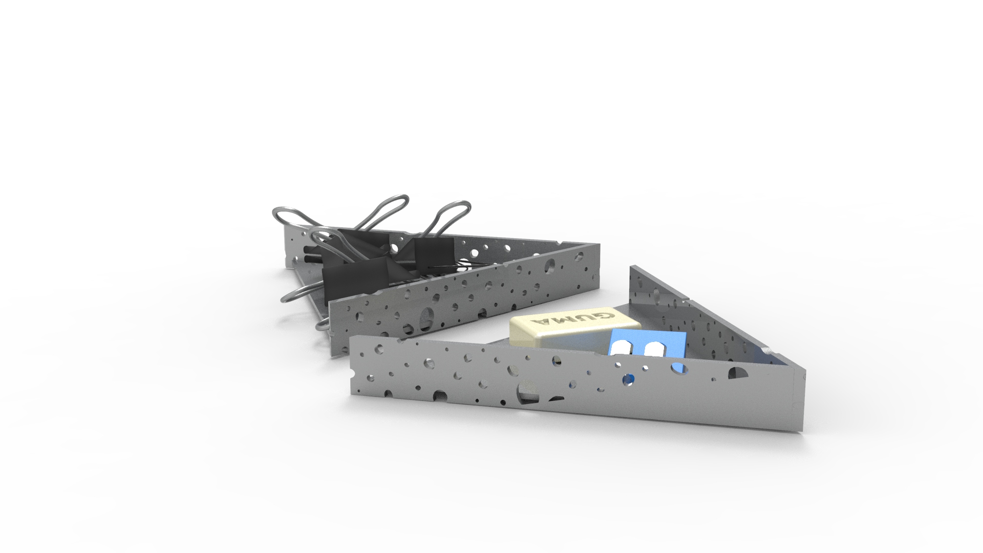 Inspirací pro mé řešení kancelářského setu byla výseč sýru a to trojúhelníková geometrie, plocha a nesymetrické otvory.